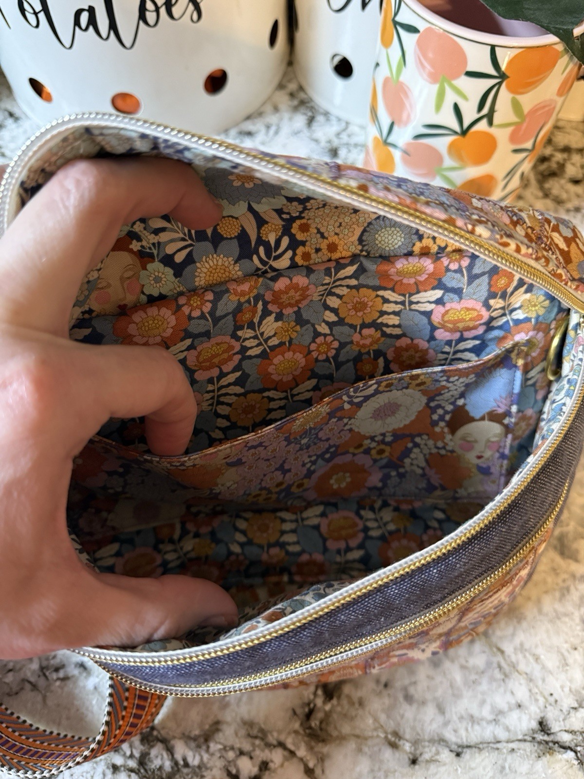 Handcrafted and designed by me, Julia Makes It (Etsy and Facebook). Intricate patchwork quilted design on the front. Features an exterior front zipper pocket, main zipper pocket, and inside open pocket for smaller items such as a phone or wallet. Colorful lining and acrylic strap add to the overall look. If interested, check out my other listings.