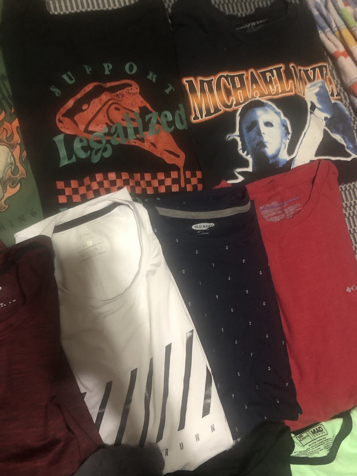 Great condition, pet free smoke free. Last row is XL. Elevate your wardrobe with a diverse bundle of men's graphic tees and Dri-Fit shirts, available in sizes Large and XL. Each shirt is designed to offer a comfortable classic fit, with a crew neckline and short sleeves, perfect for any casual occasion. The assortment includes shirts that showcase a variety of themes, from retro and preppy to hippie and grunge, ensuring you'll find a shirt that matches your style and mood. Crafted from a blend of cotton, polyester, and cotton blend materials, these shirts are machine washable for easy care. The multicolor graphic patterns add a touch of personality to each piece, making them ideal for those who appreciate art and unique design. Whether you're hitting the outdoors or just lounging around, these shirts are made for all seasons and are sure to become go-to staples in your collection.