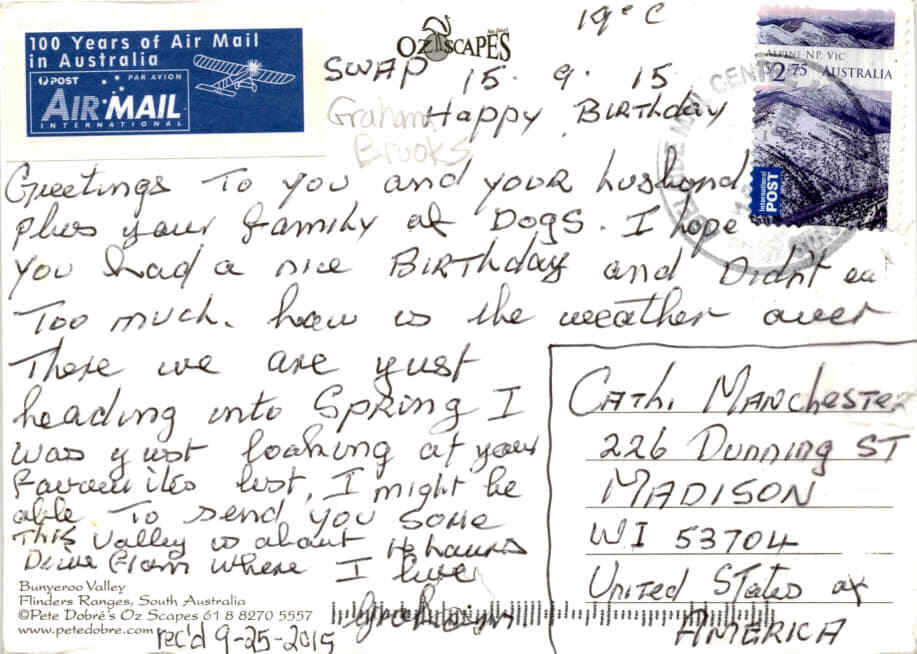 MAKE AN OFFER. THE MORE YOU BUY THE BETTER DEAL I WILL ACCEPT The postcard features a photograph of Bunyeroo Valley in the Flinders Ranges, South Australia, with a caption marking 100 years of airmail in Australia. The sender, Aline from Victoria, is wishing Graham a happy birthday. The postcard also mentions the weather in Australia, specifically in Manchester, and the upcoming spring season.