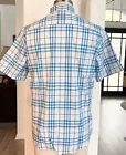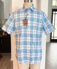 Burberry Check Button Down Short Sleeve Shirt 100% authentic 95% Cotton 5% Elastane Brand new with tags and extra buttons Medium Pit to Pit: 21.5 inches Shoulder to Shoulder: 18 inches length: 30 inches LARGE Pit to Pit: 23.5 inches Shoulder to Shoulder: 19.5 inches length: 30 inches