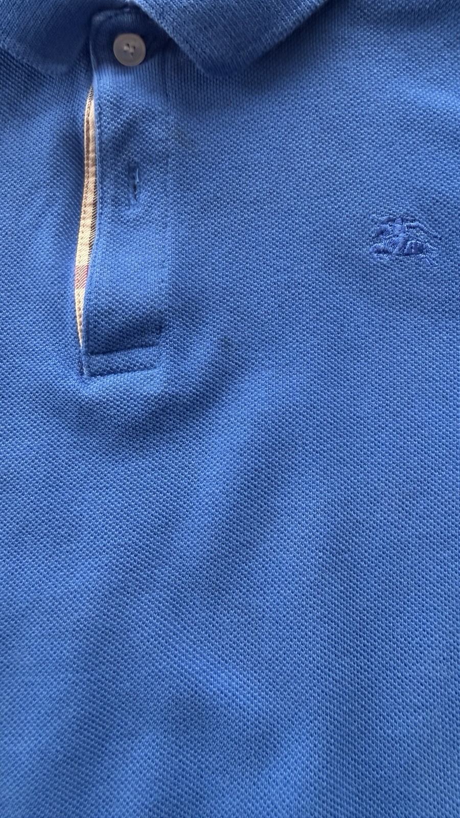 Boy’s Burberry blue polo shirt. Size 8, but runs small. Tiny mark on front as picture shows.
