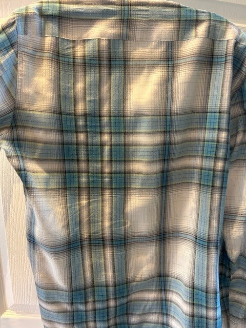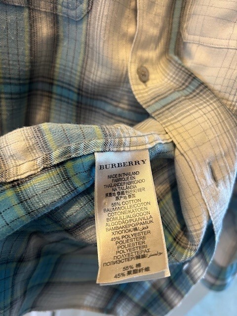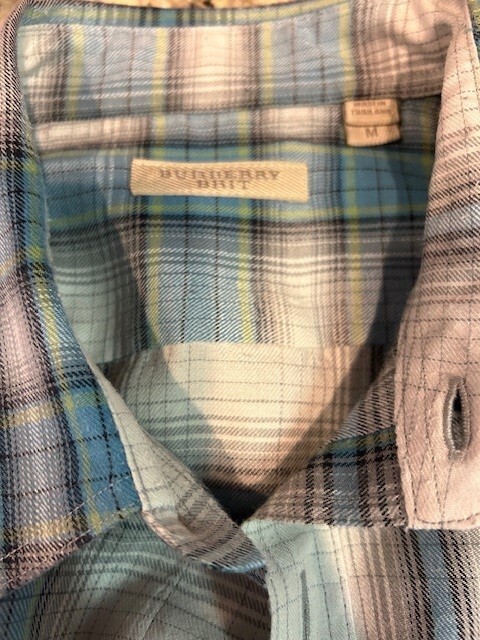 Absolutely genuine great condition Burberry Brit men's shirt in size M, featuring a green/blue nova check design, collared neckline and a button closure. Made in Thailand. It is made from a cotton blend fabric (55% cotton/45% Polyester). I will provide the measurement below. Please note, because it is a cotton blend fabric the surface of the shirt is not smooth (I tried to show it in the last picture). Great condition, no holes, snags, etc, etc. The shirt was hand measured by me: Shoulder width: 17.5" Chest Width: 20.5"-21" Length: 30"