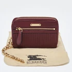 Compact and stylish, this wallet will be your favorite grab and go companion. Designed from quality materials, its interior is divided into different compartments to store your cards and cash perfectly.Certified by The Luxury Closet - This item has gone through a detailed authentication process overseen by our experts. We offer a lifetime guarantee of authenticity on all our items. Import duties, taxes and charges are not included in the item price. These charges are the buyers responsibility. Please check with your country’s customs office to determine what these additional cost will be prior to buying. Our eBay Store About Us Contact Us Add to Favorite Sellers Burberry Burgundy Leather Double Zip Compact Wallet $226.6 Compact and stylish, this wallet will be your favorite grab and go companion. Designed from quality materials, its interior is divided into different compartments to store your cards and cash perfectly. Product Details Brand Color Burgundy Dimensions Height: 9 cm, Width: 3 cm, Length: 14 cm Material Leather Size Outsole Width Outsole Length Heel Height Includes Original Dustbag Certified by The Luxury Closet This item has gone through a detailed authentication process overseen by our experts. We offer a lifetime guarantee of authenticity on all our items. How We Check The in-house team of experts at The Luxury Closet is highly trained to verify the authenticity and the condition of the luxury products. They ensure that only 100% authentic items are put on sale.The evaluation process is unique with its own mix of assessment criteria and differs according to the category. Each item is evaluated based on the following combination of hallmarks, hardware, stitching, symmetry, material, craftsmanship, stamping, codes, hologram stickers, and packaging. Our authenticators also check if the items have been modified or amended (e.g., aftermarket diamonds, replaced batteries, repaired bags, etc.) International Buyers Import duties, taxes and charges are not included in the item price. These charges are the buyers responsibility. Please check with your country’s customs office to determine what these additional cost will be prior to buying.