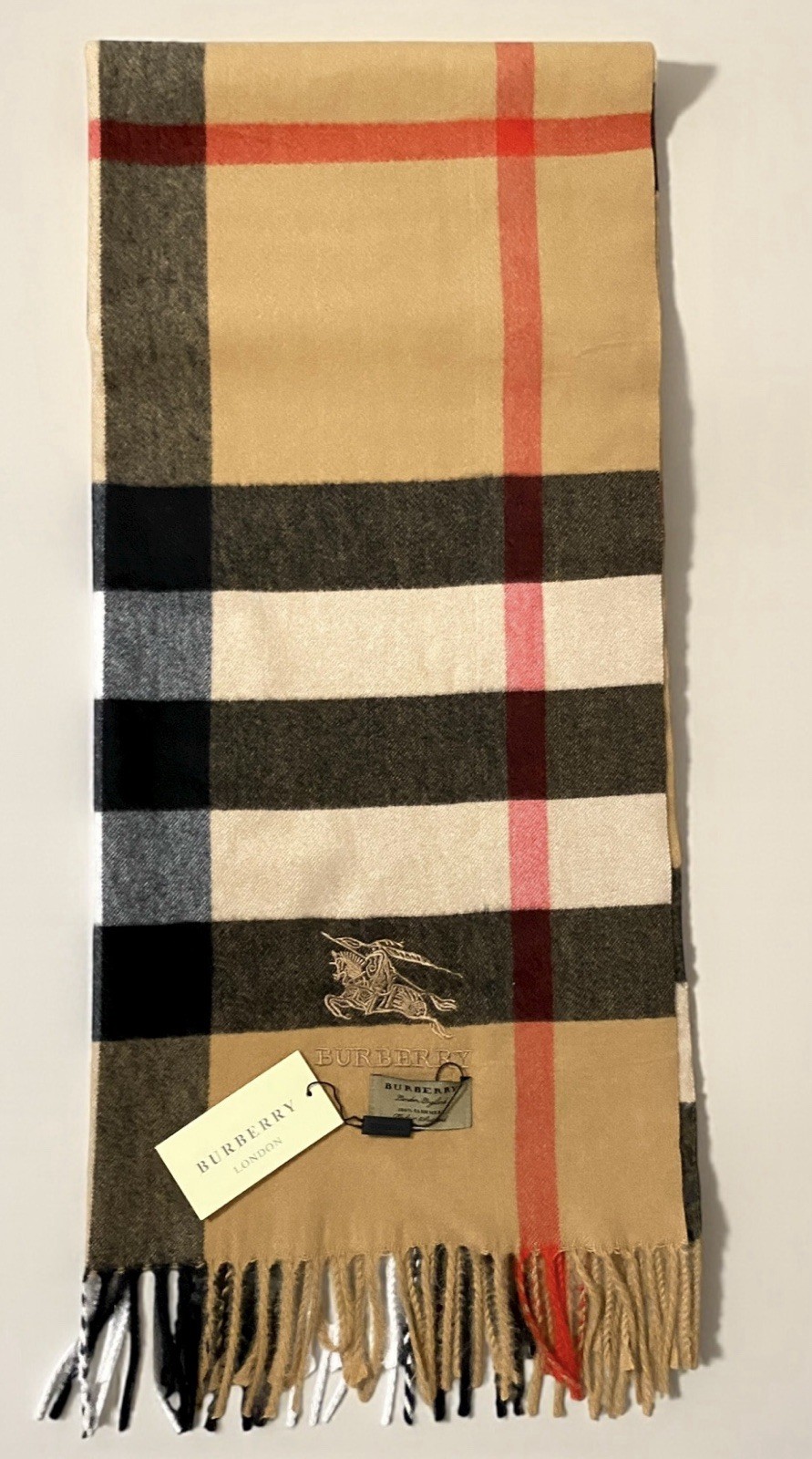 Burberry scarf, brand new, never worn, still with tag attached. Comes with its box and Burberry shopping bag. ➕Condition : Scarf : brand new and in perfect condition Bag : in perfect condition Box : slightly damaged on the sides, minor visible marks, no impact on the product 📦 Carefully packaged and fast shipping 💬 Additional photos available upon request