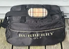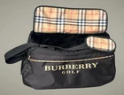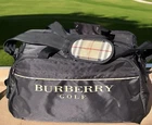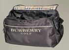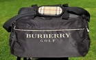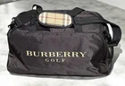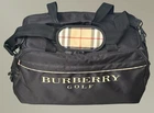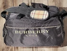 Authentic Vintage Burberry Golf Duffle Weekend Travel Bag - Black Nylon with NOVA Check-Trim NEVER USED (22"x12"x12") Crafted for the discerning traveler, this Burberry Golf Duffle Weekend Travel Bag combines elegance with practicality. Its signature Nova Check Plaid trim of beige, black, red and white adds a touch of class to the sleek black nylon construction, ensuring durability and a timeless style. Designed with golf enthusiasts in mind, this versatile bag suits a range of sporting activities. It has a water-resistant exterior, a comfortable shoulder strap, and a sturdy carry handle for easy transport. Functional zip closure and a zippered shoe compartment on the bottom keeps items dry and secure, making it an essential accessory for the active golfer on the go. In excellent condition - Pre-owned but never used. Selling for a friend whose late wife bought amazing amounts of high-end golf gear and accessories. This bag still had the plastic around the bottom studs. Has an inside zipper compartment and outside zipper compartments on each side - one for shoes and another smaller one of mesh with a tie at the top can be used to hold a water bottle, It also has a place for your I.D. Has a double handle as well as a removable shoulder strap that extends up to 48 inches. In excellent condition - was never used! Please see all the photos as they are an important part of this description Made of 100% nylon microfiber fabric that is water resistant This bag measures approximately 22 inches x 12 inches x 12 inches It weighs 2 lbs., 12 ozs. (without packaging) Will be carefully packaged and shipped to you via USPS Mail, UPS or Federal Express THANKS FOR STOPPING BY
