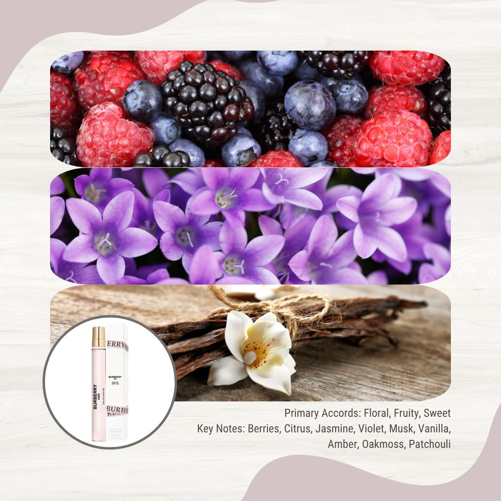 Burberry Her Eau de Parfum This 0.33oz (10mL) travel-size spray is a convenient way to carry your signature scent wherever you go. Burberry Her is a beautifully balanced floral and fruity fragrance with a playful mix of juicy berries and bright citrus, softened by delicate jasmine and violet. The warm base of musk, vanilla, and patchouli adds a touch of sensuality, making it ideal for both daytime and evening wear. Especially fitting for spring and summer, this perfume is perfect for everyday use, special occasions, or romantic nights out. A great gift option or personal signature scent that’s easy to love and easy to carry. The fragrance opens with berries and citrus, melts into jasmine and violet, and finishes with soft notes of musk, creamy vanilla, amber, oakmoss, and patchouli. -------------------------------------------------------------- Shipping and Return Policy Summary We offer free shipping within the continental US using USPS or FedEx. Orders ship within 1 business day and typically arrive within 2 to 10 business days. Orders over 200 dollars require a signature at delivery. You will receive a tracking number once your order ships. We accept free returns within 30 days if the item is in original condition. Misused or unauthorized returns may incur a restocking fee between 10 and 50 percent. Exchanges are not available once a return has started. To start a return, go to your eBay purchase history, select the item, and follow the return prompts. If there is an issue with your order, contact us through eBay messages with a brief description, a photo if needed, and whether you want a replacement or other resolution. We will respond quickly to help. For any questions, send us a message through eBay. Thank you for choosing Velour Beauty!