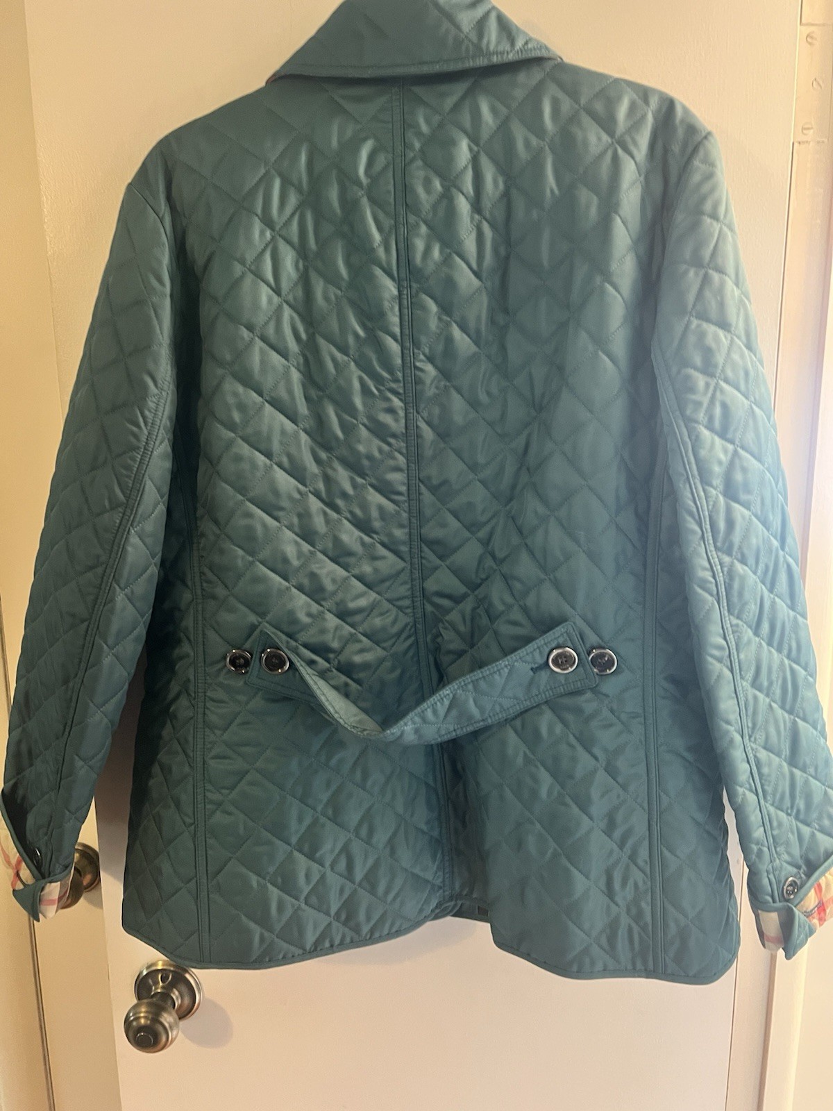The Burberry Jacket is a stylish and sophisticated option for women, showcasing the iconic check pattern and quilted design. Made from polyester with a polyester insulation material, this jacket is perfect for casual occasions in the spring season. The green color adds a pop of vibrancy to the designer piece, while the size L ensures a comfortable fit. Machine washable for easy care, this Burberry Brit jacket is a timeless addition to any wardrobe.