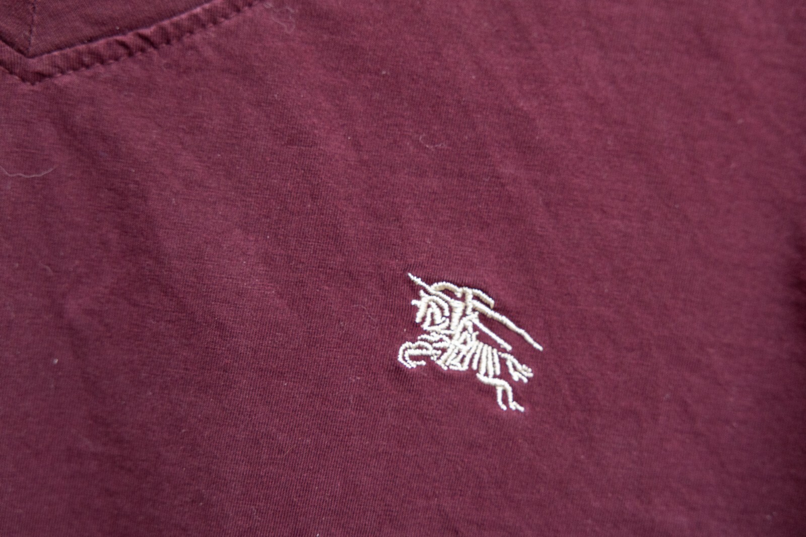 Burberry London Mens Burgundy Long Sleeve Tshirt Size Medium 100% Cotton, Made in England Good condition - Only one flaw, a spot on the front, shown in the 3rd photo. It's pretty well blended in, and not very noticeable
