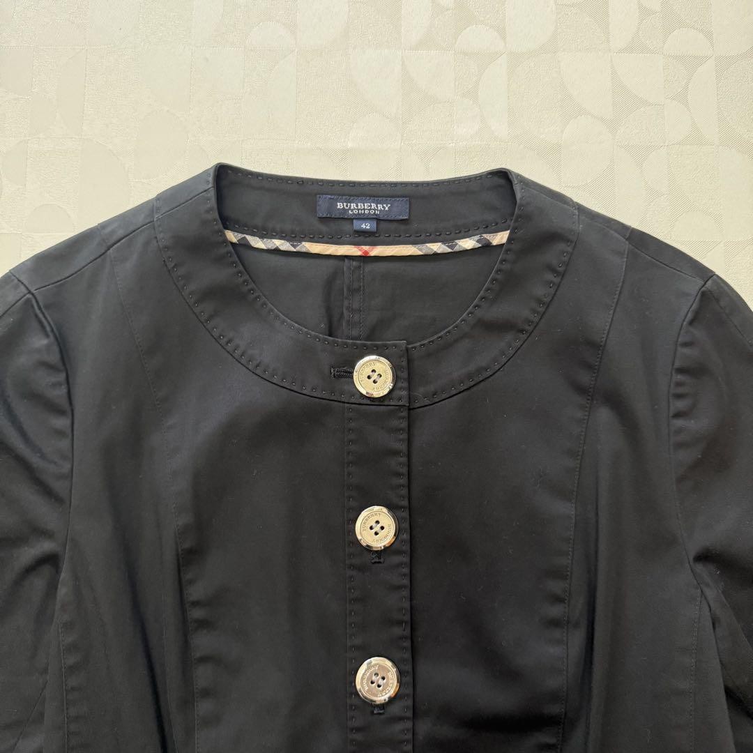 Burberry London No-Collar Peplum Jacket Silver Button Black Key Features This is a stylish BURBERRY LONDON sleeveless peplum jacket with a no-collar design and silver buttons. Made in Japan by Sanyo Shokai, it features a classic black color. Size 42 (please convert cm to inches). The jacket measures approximately 19.7 inches in length, 15 inches shoulder width, 17.1 inches bust, and 17.3 inches sleeve length. Crafted from 96% cotton and 4% polyurethane, it offers a comfortable fit. Condition is good with no noticeable damage or stains; however, please note it is pre-owned. Ideal for fashion-conscious buyers seeking quality and elegance. Item Specifics: Brand: BURBERRY LONDON Type: Peplum Jacket Model/Style: No-collar, sleeveless Color: Black Size: 42 (please convert cm to inches) Material: Cotton 96%, Polyurethane 4% Country/Region of Manufacture: Japan Specifications Brand Burberry London Country Japan Product Description Item Title Burberry London No-Collar Peplum Jacket Silver Button Black Payment Supports managed payments Please pay within 5 days after auction is finished. About Us We are located in Japan. It's our pleasure to make you happy by proposing our recommend item. If you have any questions or request about items, please feel free to ask us. International Buyers - Please Note: -Import duties, taxes, and charges are not included in the item price or shipping charges. These charges are the buyer's responsibility. -Please check with your country's customs office to determine what these additional costs will be prior to bidding/buying. -These charges are normally collected by the delivering freight (shipping) company or when you pick the item up - do not confuse them for additional shipping charges. -We do not mark merchandise values below value or mark items as - gifts - The US and International government regulations prohibit such behavior. Thank you for your understanding.