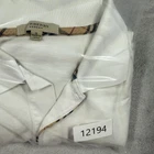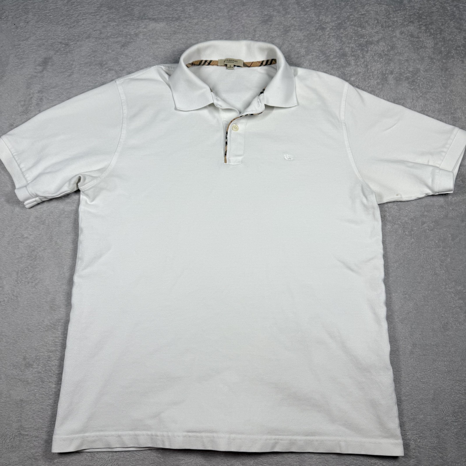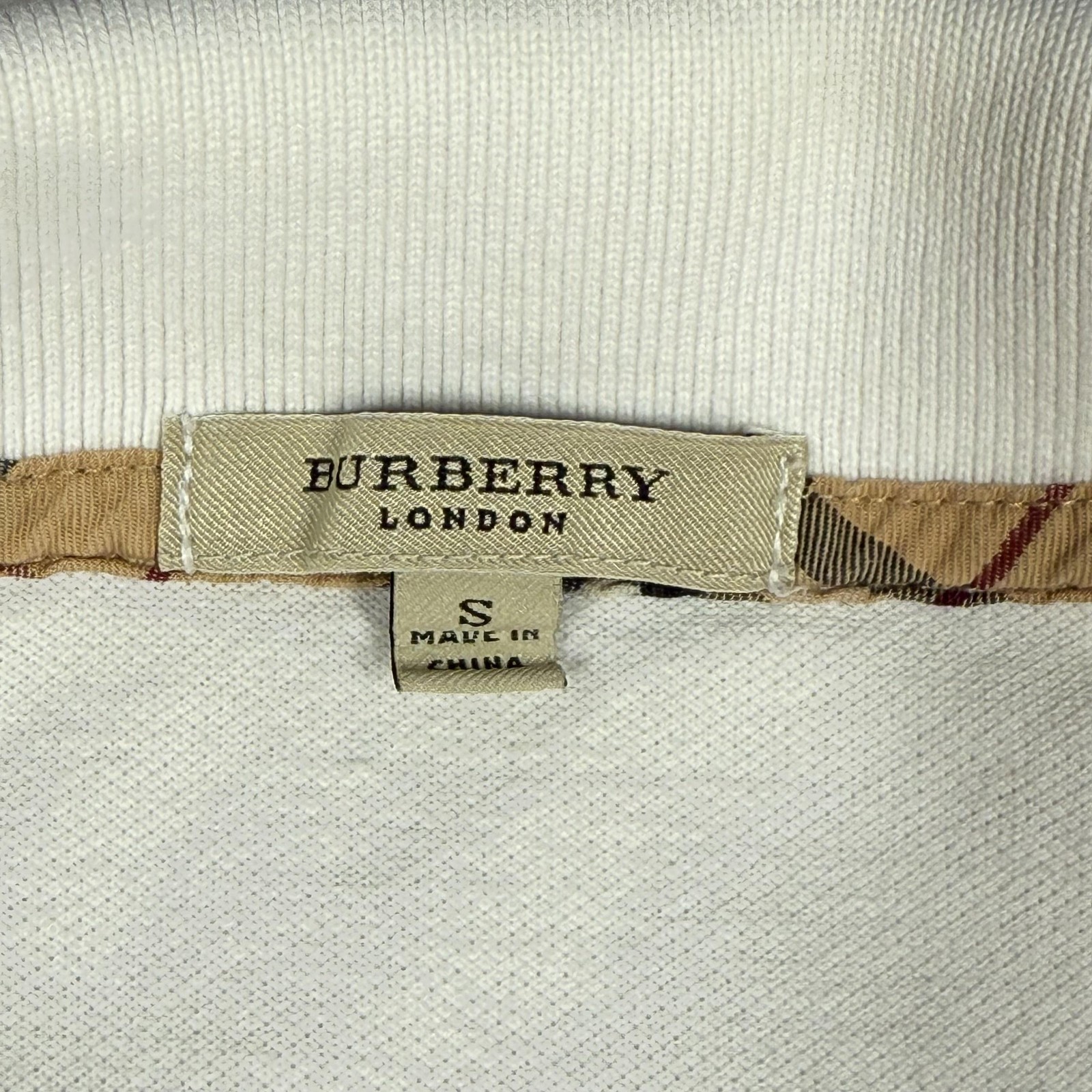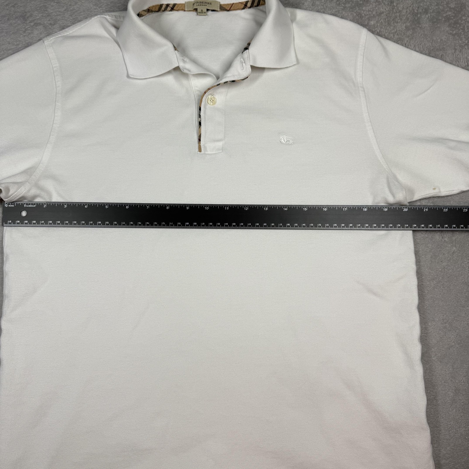 Burberry Polo Shirt Mens Small White Nova Check Trim Embroidered Logo Classic Condition: Good used condition. Light overall wear with some faint stains/discoloration. Small mark on right underarm and subtle discoloration on sleeve seam—both shown clearly in photos. Features classic Burberry London styling with signature Nova Check accent on inside collar placket and back neck tape. 100% cotton, soft breathable pique knit for comfortable everyday wear. Color: White with check pattern trim Burberry equestrian embroidered logo at left chest Tag size: Small (Mens). See photos for measurements. Made in China Extra replacement button sewn to inside tag A wardrobe staple perfect for business casual, golf, or preppy style
