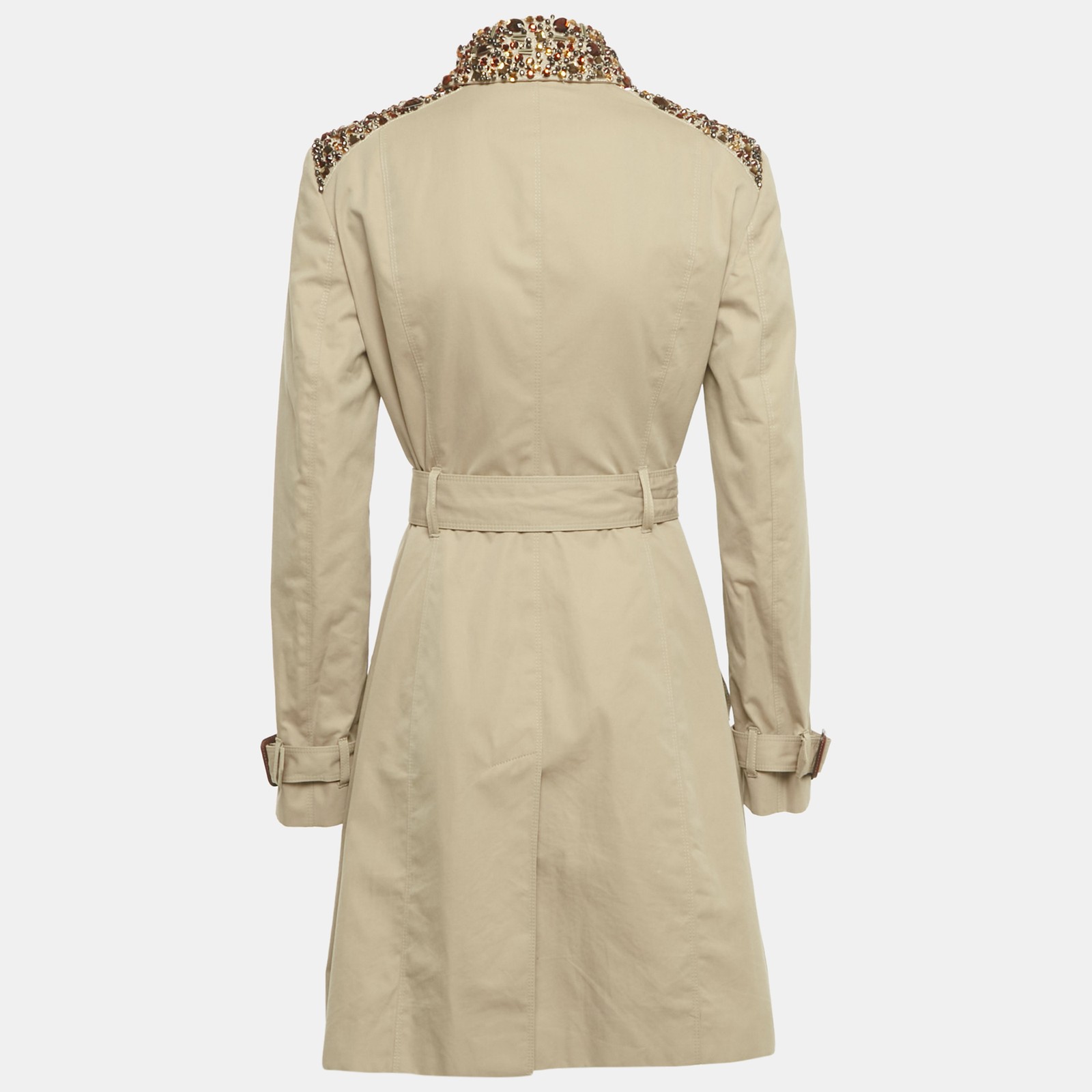 A refined reinterpretation of a house classic, this Burberry Prorsum trench coat is cut in beige cotton gabardine with understated embellishments. The tailored fit and heritage detailing lend it timeless versatility.Certified by The Luxury Closet - This item has gone through a detailed authentication process overseen by our experts. We offer a lifetime guarantee of authenticity on all our items. Import duties, taxes and charges are not included in the item price. These charges are the buyers responsibility. Please check with your country’s customs office to determine what these additional cost will be prior to buying. Our eBay Store About Us Contact Us Add to Favorite Sellers Burberry Prorsum Beige Embellished Cotton Gabardine Trench Coat M $2939.2 A refined reinterpretation of a house classic, this Burberry Prorsum trench coat is cut in beige cotton gabardine with understated embellishments. The tailored fit and heritage detailing lend it timeless versatility. Product Details Brand Color Beige Dimensions Material Cotton, Gabardine Size M Outsole Width Outsole Length Heel Height Includes Certified by The Luxury Closet This item has gone through a detailed authentication process overseen by our experts. We offer a lifetime guarantee of authenticity on all our items. How We Check The in-house team of experts at The Luxury Closet is highly trained to verify the authenticity and the condition of the luxury products. They ensure that only 100% authentic items are put on sale.The evaluation process is unique with its own mix of assessment criteria and differs according to the category. Each item is evaluated based on the following combination of hallmarks, hardware, stitching, symmetry, material, craftsmanship, stamping, codes, hologram stickers, and packaging. Our authenticators also check if the items have been modified or amended (e.g., aftermarket diamonds, replaced batteries, repaired bags, etc.) International Buyers Import duties, taxes and charges are not included in the item price. These charges are the buyers responsibility. Please check with your country’s customs office to determine what these additional cost will be prior to buying.