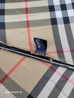This Burberry umbrella features the iconic Nova Check plaid pattern in a classic beige color, making it a stylish accessory for women. The compact/folding design and automatic feature provide convenience for on-the-go use. Made of durable nylon with wooden accents, this umbrella exudes quality and sophistication. Perfect for staying dry in style during rainy days, this unisex umbrella showcases the Burberry logo subtly on the accents.