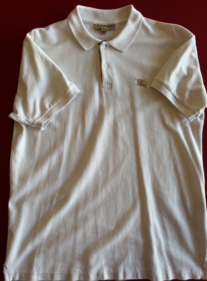 This product is a pre-owned Burberry white polo shirt in size XXL. Made for men, this regular fit polo exudes elegance and sophistication with its classic design and renowned Burberry brand. Perfect for casual or formal occasions, this polo shirt is a versatile staple in any man's wardrobe. Made from high-quality materials, this Burberry polo shirt is sure to deliver both style and comfort for the modern gentleman.
