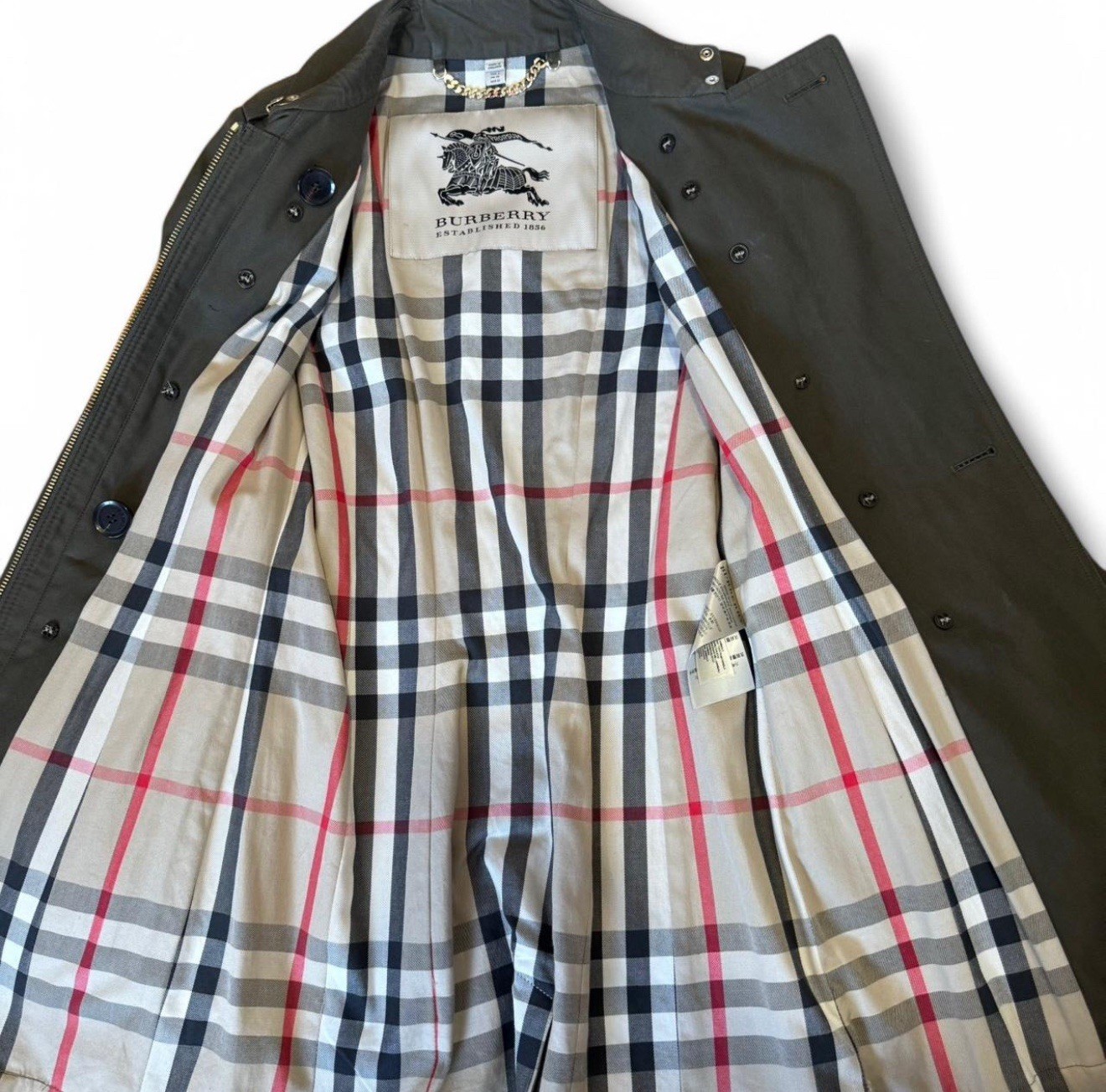 Burberry Black Belted Trench Coat with Signature Check Lining Size 2 No duplicates found on the internet Color: Black with Burberry check interior lining • Double-breasted button closure with storm flap • Detachable waist belt with metal grommet details • Zippered sleeve accents and adjustable cuff straps • Shoulder epaulets and back vent for ease of movement • Mid-thigh length Measurements: - 30 inches in length - 16 inches shoulder to shoulder - 23 inches arm length