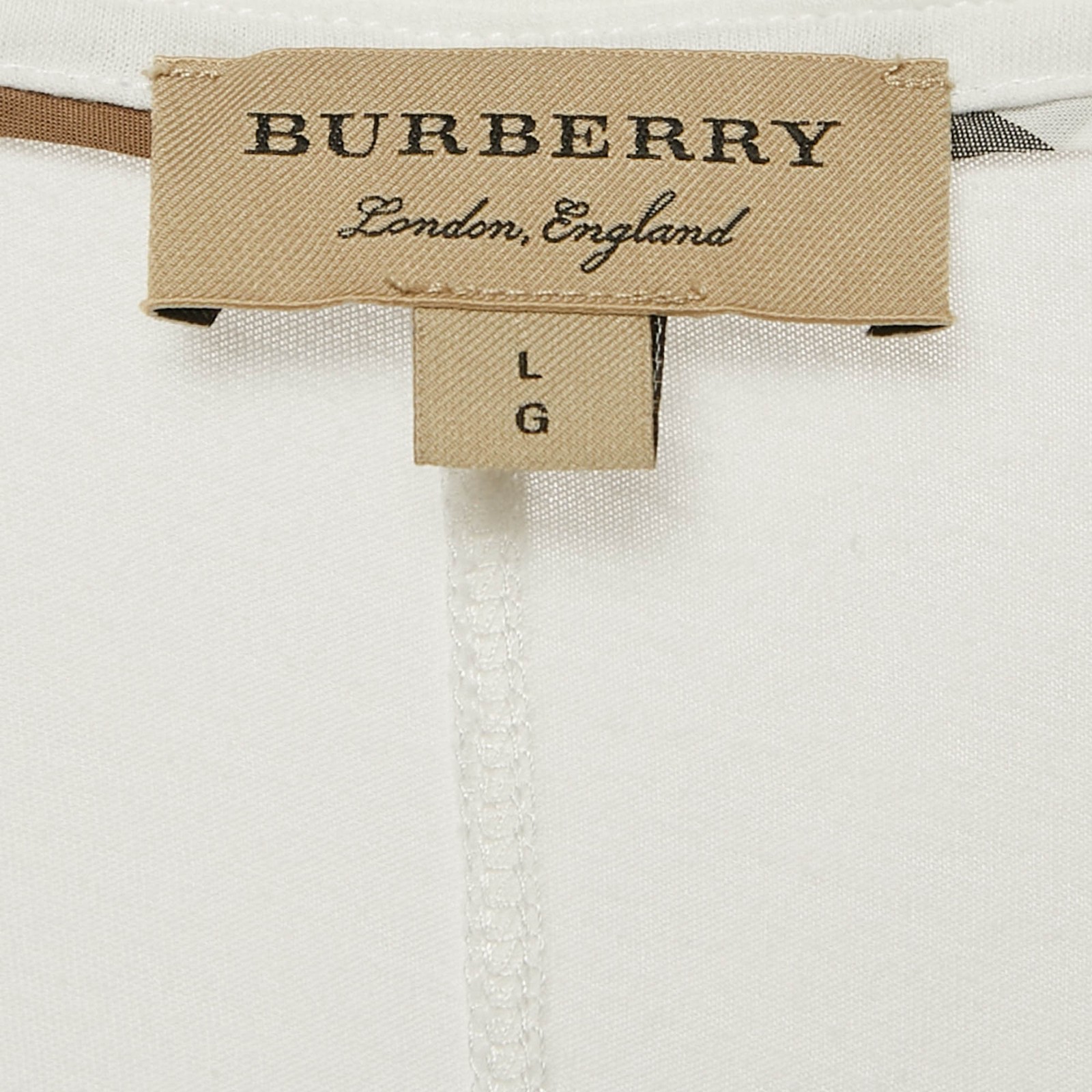 Simple yet iconic, this Burberry V neck T shirt is crafted from soft white cotton and finished with a subtle embroidered logo. A refined take on a casual staple, its ideal for layering or wearing solo.Certified by The Luxury Closet - This item has gone through a detailed authentication process overseen by our experts. We offer a lifetime guarantee of authenticity on all our items. Import duties, taxes and charges are not included in the item price. These charges are the buyers responsibility. Please check with your country’s customs office to determine what these additional cost will be prior to buying. Our eBay Store About Us Contact Us Add to Favorite Sellers Burberry White Logo Embroidered Cotton V-Neck T-Shirt L $151.8 Simple yet iconic, this Burberry V neck T shirt is crafted from soft white cotton and finished with a subtle embroidered logo. A refined take on a casual staple, its ideal for layering or wearing solo. Product Details Brand Color White Dimensions Material Cotton Size L Outsole Width Outsole Length Heel Height Includes Certified by The Luxury Closet This item has gone through a detailed authentication process overseen by our experts. We offer a lifetime guarantee of authenticity on all our items. How We Check The in-house team of experts at The Luxury Closet is highly trained to verify the authenticity and the condition of the luxury products. They ensure that only 100% authentic items are put on sale.The evaluation process is unique with its own mix of assessment criteria and differs according to the category. Each item is evaluated based on the following combination of hallmarks, hardware, stitching, symmetry, material, craftsmanship, stamping, codes, hologram stickers, and packaging. Our authenticators also check if the items have been modified or amended (e.g., aftermarket diamonds, replaced batteries, repaired bags, etc.) International Buyers Import duties, taxes and charges are not included in the item price. These charges are the buyers responsibility. Please check with your country’s customs office to determine what these additional cost will be prior to buying.