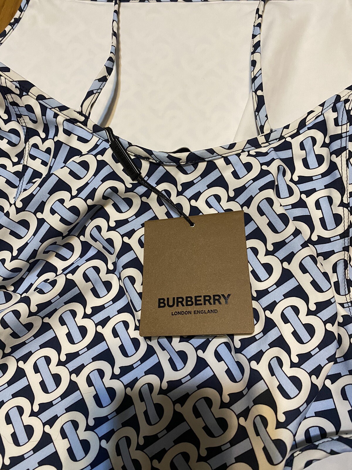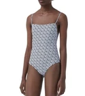 Burberry Monogram Print Swimsuit This low-back swimsuit is decorated with a graphic monogram print. Color: Cobalt Blue Ippat. Size: Small. Spaghetti straps Squareneck Pull-on style 59% polyamide/41% elastane Lining: 59% polyamide/41% elastane Machine wash Made in Portugal SIZE & FIT About 23.2" from shoulder to hem Model measurements: 5'10" tall Model is wearing a US size Small ABOUT THE BRAND Founded in 1856 by 21-year-old Thomas Burberry, the brand set out with a mission to stylishly protect against British weather¿and Burberry's iconic trench coat was born. In the 1920s, its renowned check pattern was introduced as the coat's lining.
