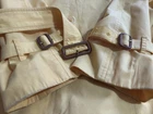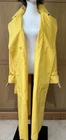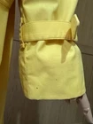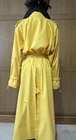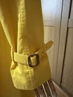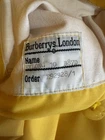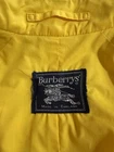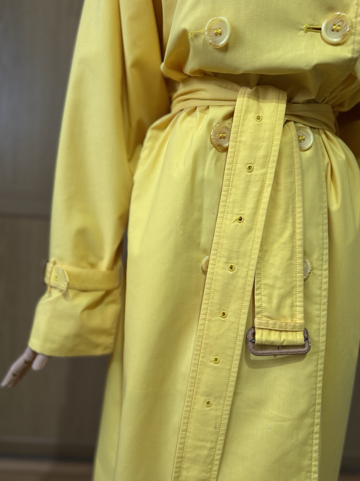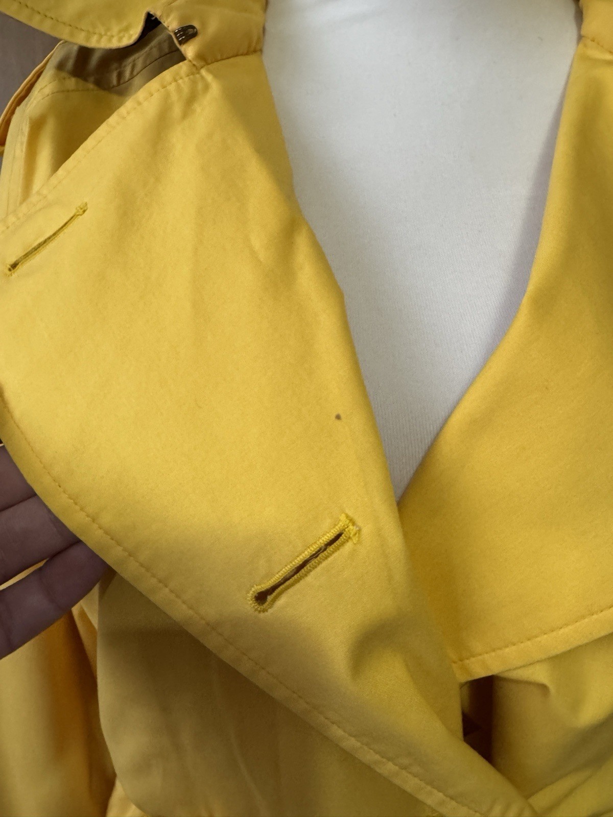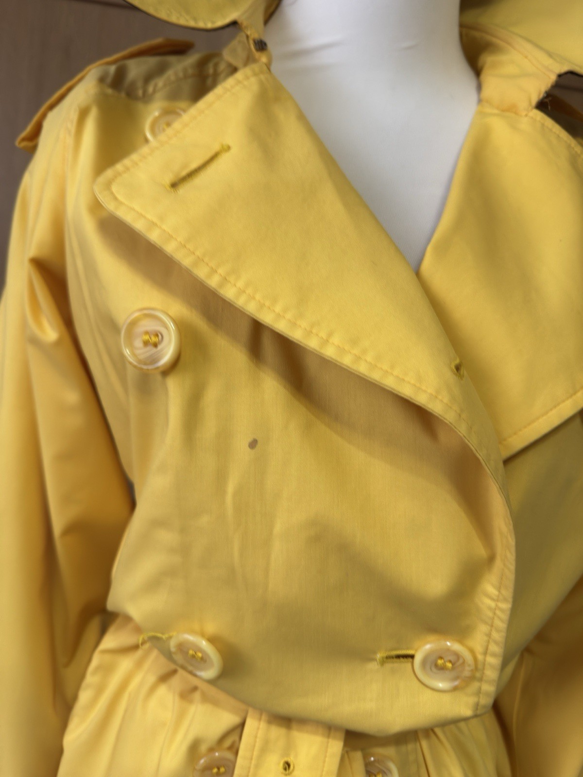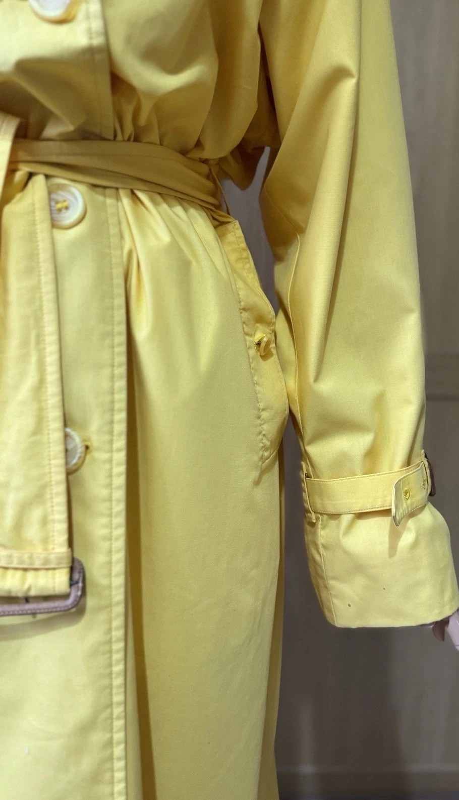 Make a bold and rare find with this Vintage Burberrys Bright Yellow Trench Coat, a striking and collectible piece from the 1980s/90s. Burberrys produced yellow trenches only in limited runs, and this extra long version is even more unusual sometimes described as a special or custom order from the era. Crafted from a lightweight cotton polyester blend, this coat is ideal for spring and summer wear, offering classic trench styling with a vibrant twist. Design Features Rare bright/butter yellow colour Extra long length for dramatic elegance Double breasted front with original buttons Matching waist belt with leather buckle Leather trimmed belted cuffs Point collar Epaulettes with shoulder pads for shape Side button welt pockets. A standout collector’s piece that combines traditional trench tailoring with a rare colourway. Measurements (Approx.) Shoulder to shoulder: 47 cm Pit to pit: 54 cm Length (collar to hem): 128 cm Sleeve length: 58 cm Sizing Notes Best for UK 8/10. The extra long cut gives a sleek, elongated silhouette a true statement trench. Condition Very good vintage condition. ✔ No structural damage ✔ Leather buckle and cuff straps in excellent condition ✔ All buttons present except one missing on the back ✔ Light marks on front, sleeve, and back may lift with professional dry cleaning Overall, extremely well preserved for its age, especially considering the rare colour.