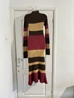 Elevate your autumn/winter wardrobe with this stunning ribbed knit maxi dress. Featuring a bold horizontal stripe pattern in earthy tones of chocolate brown, mustard yellow, and deep burgundy, this piece offers a perfect 70s-inspired aesthetic. It’s a figure-hugging, long-sleeve design with a cozy mock neck for extra warmth. In fantastic pre-loved condition with no visible flaws. A versatile staple that pairs perfectly with boots and a trench coat! #BohoStyle #modfashion #ribbedknitdress #earthtones #autumnfashion #70s