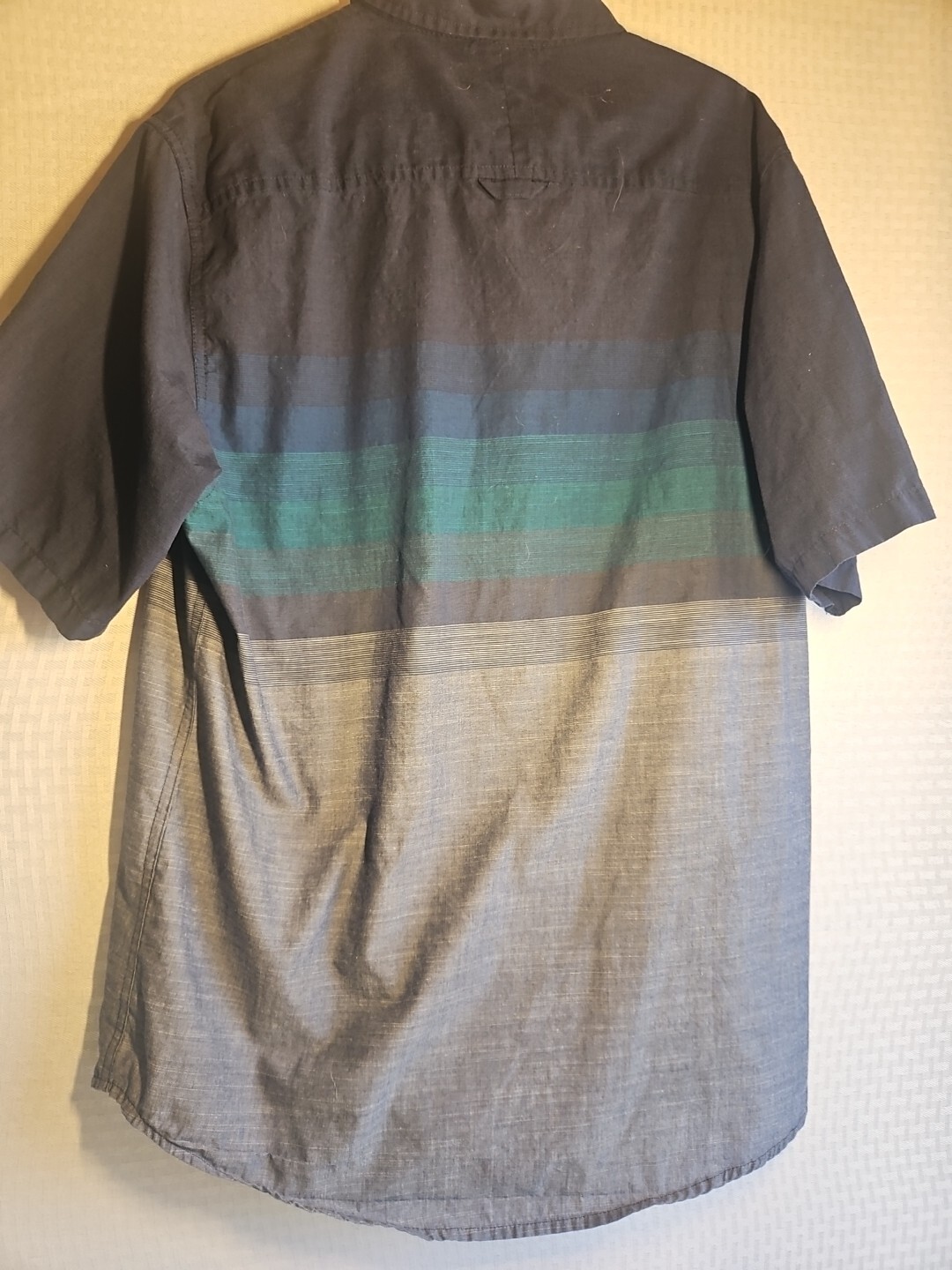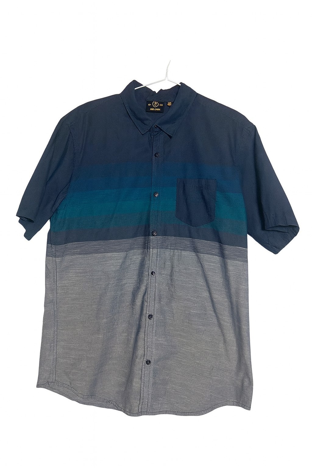 This Burnside men’s short sleeve button-up shirt is a stylish casual piece in size XL. It features a gradient stripe design in shades of blue, teal, and gray, with a single chest pocket. Made from a lightweight cotton/polyester blend, it’s comfortable and easy to care for. Brand: Burnside Size: XL Color: Blue/Teal/Gray Stripes Material: 55% Cotton, 45% Polyester Style #: BH9251B Made in: Bangladesh Features: Button front, short sleeves, chest pocket, straight hem Care: Machine wash cold, tumble dry low, warm iron if needed Perfect for casual wear, vacations, summer outings, or everyday comfort. Condition: Pre-owned, good condition. No holes or stains noted. From a pet and smoke-free home Burnside shirt, men’s button up, XL short sleeve, casual shirt, striped shirt, blue green gray top, gradient shirt, cotton blend shirt, vacation shirt, lightweight summer shirt, beachwear, everyday casual