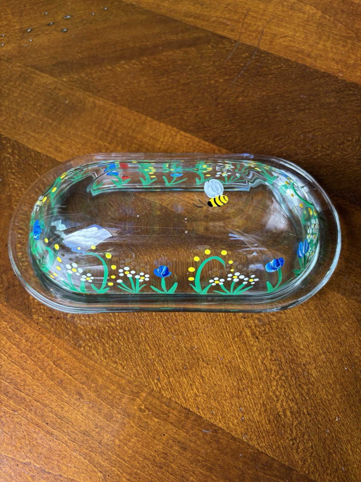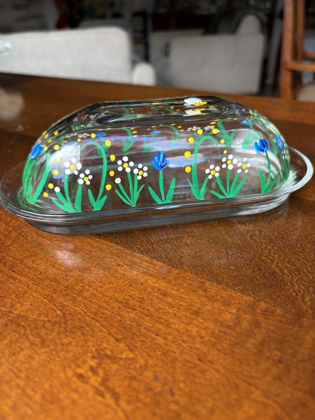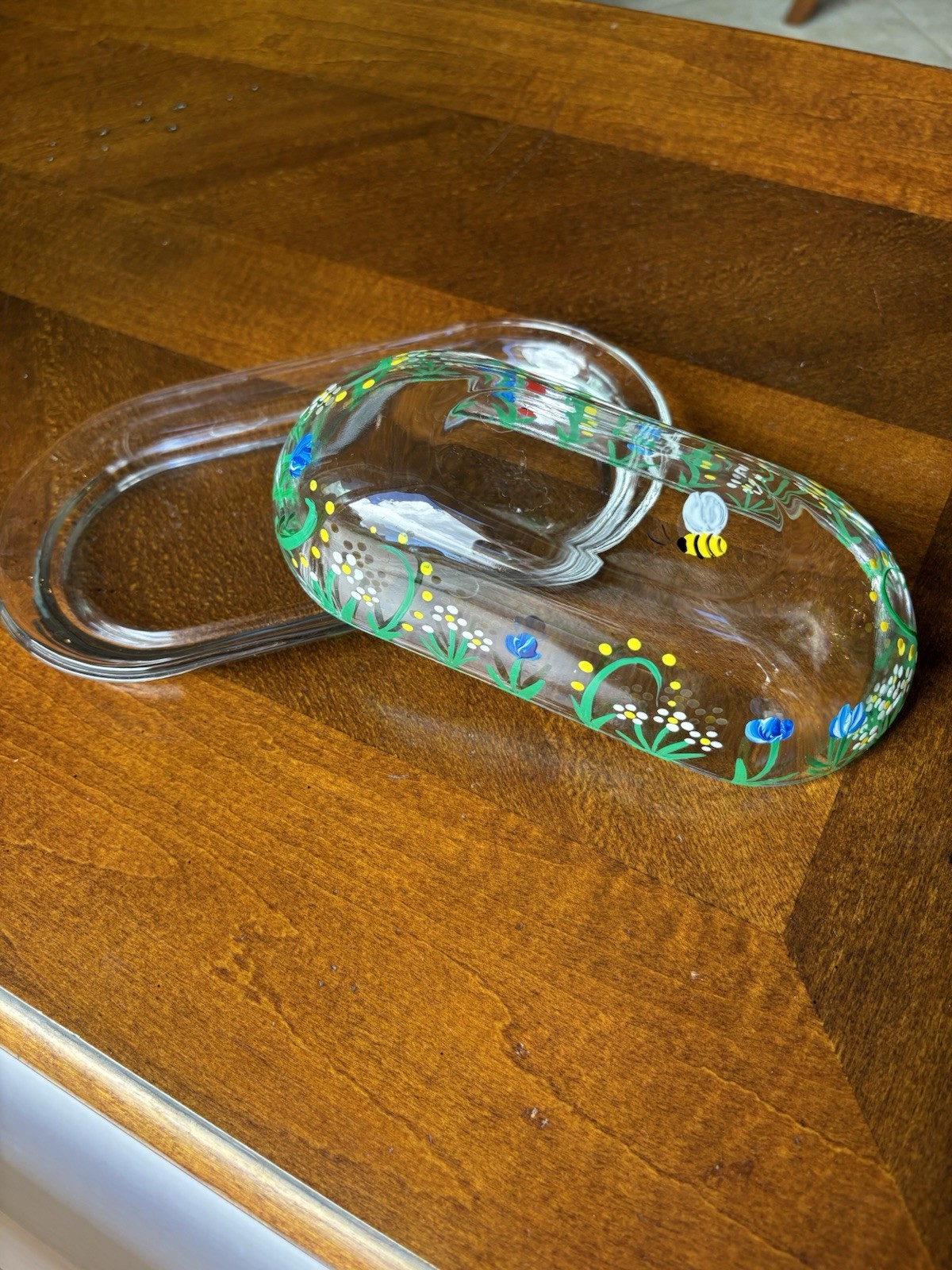 This hand-painted glass butter dish features a lovely floral pattern with bees, ladybugs, and flowers, adding a charming touch to your kitchen decor. The clear glass material allows the beauty of the painted design to shine through, making it both functional and decorative. Perfect for keeping butter fresh and easily accessible while also adding a whimsical touch to your dining experience.
