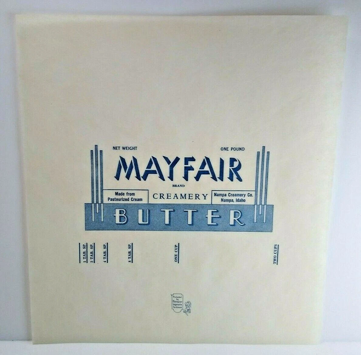 Butter Wrapper Mayfair Napa Idaho One Pound Vintage Original Circa 1940's NOS Original vintage circa 1940's era unused butter wrapper. Excellent condition 8.75" x 9.75". More vintage wrappers in our store. SHIPPING Buyer pays shipping and handling. Bundle and save by using cart and making single payment. International buyers are responsible for any import fees/taxes. ABOUT US Seller of vintage collectibles, gifts, advertising, artwork, original pinball flyers, vinyl records, video arcade flyers, pinball machine translites, game manuals, score cards, magazines, antique Halloween and holiday postcards, Christmas items, super hero memorabilia, horror themed art. Bundle and save by using the cart.