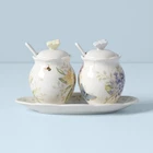 The most popular casual dinnerware collection in America, Butterfly Meadow is truly a contemporary mix and match classic. Inspired by the artistry of Louise Le Luyer, there are many delightful pattern varriations to choose from, each offering an exquisite array of butterflies, blooms and other wonders of nature, all rendered in a soft color palette. Crafted of the finest porcelain, Butterfly Meadow is the perfect choice for today. All of the dinnerware is safe for use in the dishwasher. Designed for chip-resistant durability, Butterfly Meadow will take a cherished place in your home for many years and offers the opportunity to expand your collection with the incredible range of dining, decor and gift giving choices available. Best of all, this versatile, stylish and fun collection is created by , America's first name in home entertaining. Known around the world for offering a unique combination of design, artistry and superior quality for over 125 years. Pretty as a picture! Your Butterfly Meadow collection is not complete without this 7 piece condiment server. Use it for sauces, dressings, mustards, honeys, jams and jellies. Giftboxed set includes 8.25" scalloped tray with 2 condiment jars, 2 slotted lids and 2 porcelain spoons. Made of chip-resistant white porcelain Microwave and dishwasher safe Florals and butterflies in exquisite colors adorn each scalloped piece Giftboxed 7 piece set includes an 8.25" tray with 2 condiment jars, 2 lids and 2 spoons