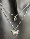 This necklace features a double chain design with a butterfly pendant adorned with rhinestones. It has a lobster closure and is made of silver-colored zinc alloy. The necklace is adjustable in length and is designed in a dangle/drop style, inspired by beauty, nature, and animals & insects. The main stone used is white/colorless rhinestone, adding a touch of elegance to the piece. 6-ne-butter2-1