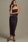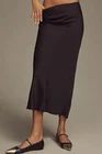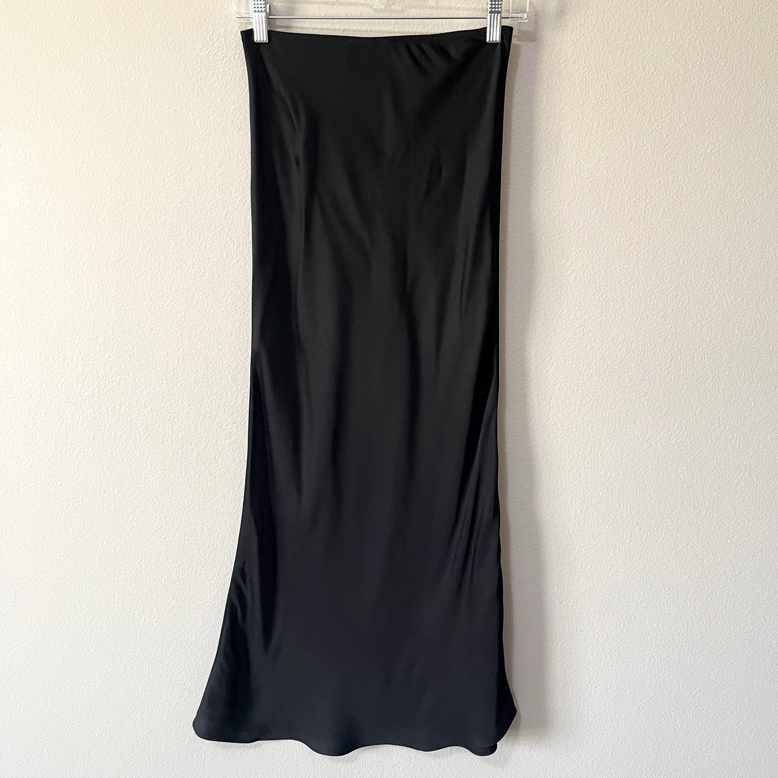 By Anthropologie black satin bias-cut maxi skirt. Size US 2. Pull-on style with elastic waistband. Pre-owned, great used condition except there are a couple of snags from a price tag near one side seam (see photos)- this wouldn't be noticeable if your top is long enough to cover the waist. Classic, city, chic, quiet luxury, old money. All measurements are approximate, not exact. Length: 37.5" Waist: 13" measured flat