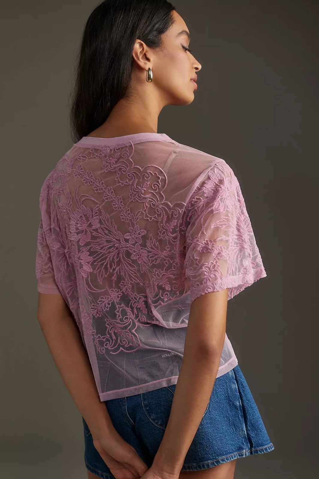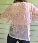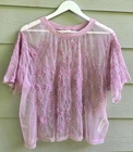 By Anthropologie elegant lilac-violet sheer lace mesh top with floral intricate embroidery. Flowing short sleeves with curved cuffs. Unlined.