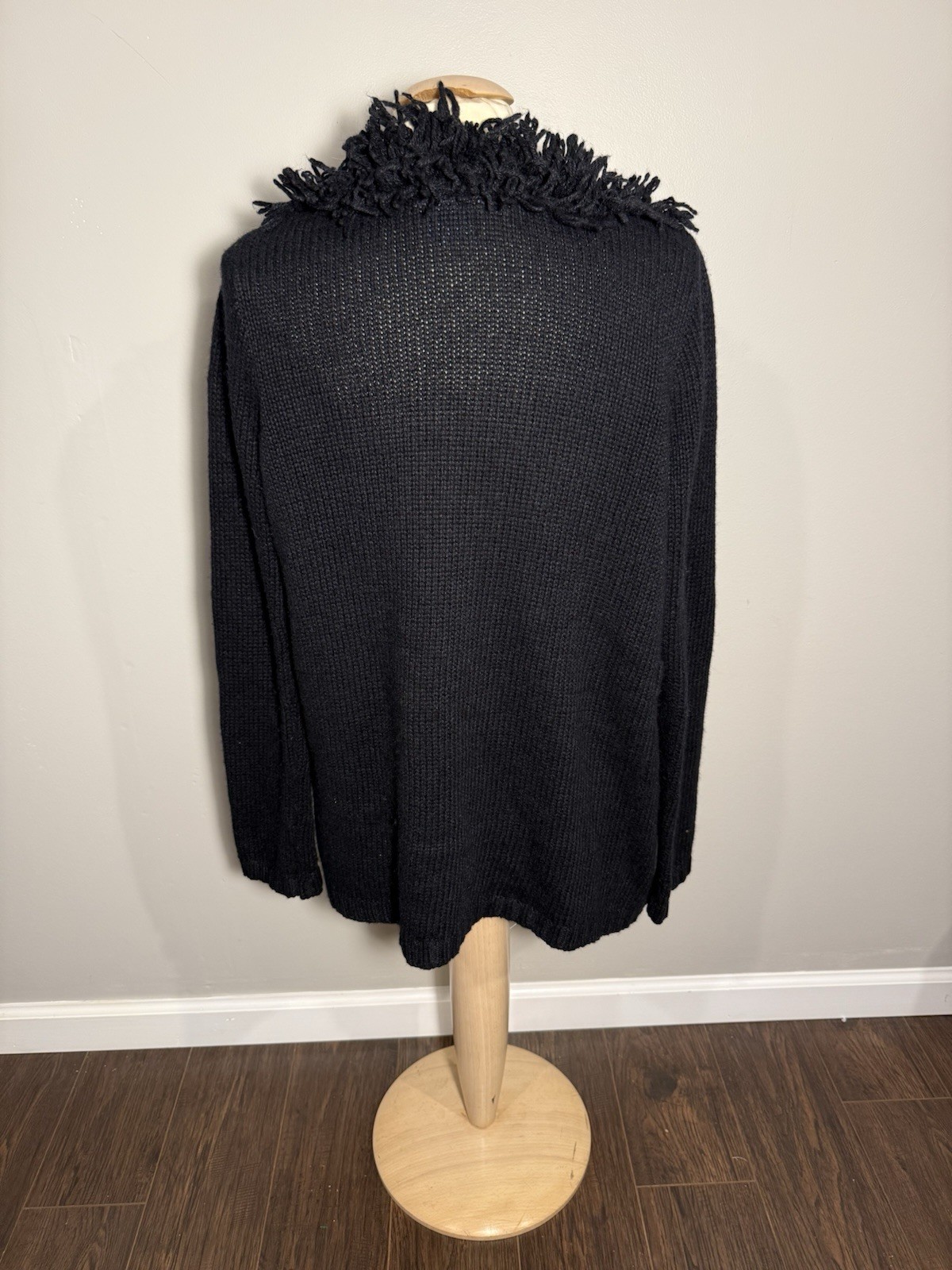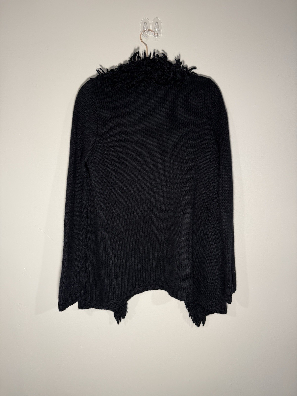 Brand: By Next Era Size: Large Color: Black Style: Open-front fringe-trim cardigan sweater Material: 55% Ramie • 15% Wool • 15% Acrylic • 15% Nylon Features: • Shaggy fringe trim along collar & front opening • Cozy textured knit • Open front • Mid-thigh length • Boho / artsy aesthetic • Made in Hong Kong Condition: Great pre-owned condition. No holes, stains, or major flaws. Some normal minor fuzz consistent with knitwear. Smoke-free home.