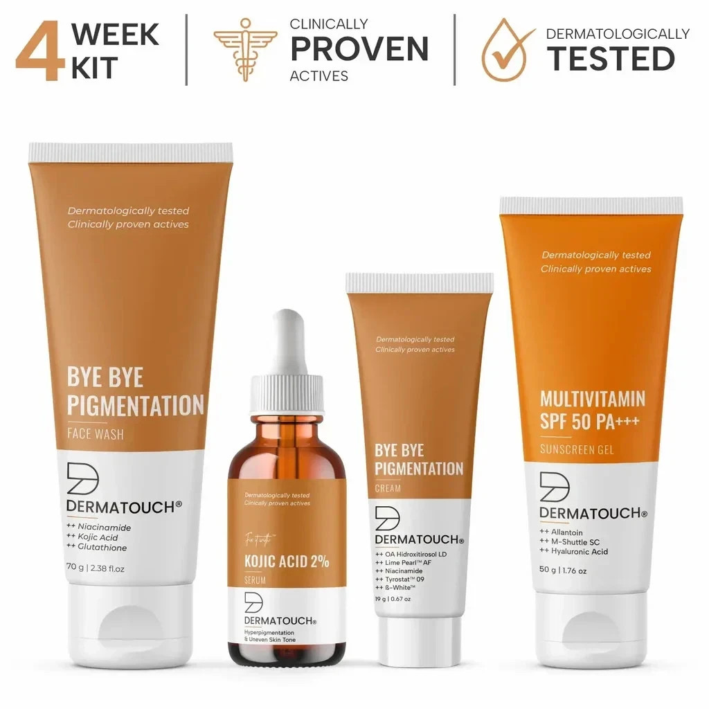 Complete Skincare Solution for Bright, Even, and Healthy Skin Dermatouch Pigmentation & Blemishes Kit is a dermatologist-tested, multi-step system designed to reduce pigmentation, fade dark spots, and improve overall skin tone. This comprehensive kit combines a brightening face wash, a potent serum, a nourishing cream, and a broad-spectrum sunscreen to cleanse, treat, protect, and nourish your skin in a single daily routine. Key Benefits: ✅ Brightens & Evens Skin Tone: Clinically proven actives target dark spots and discoloration for a radiant, uniform complexion. ✅ Reduces Pigmentation & Blemishes: Inhibits melanin synthesis and supports skin repair to minimize visible pigmentation. ✅ Protects & Nourishes Skin: Shields from UVA/UVB rays and environmental stressors while maintaining hydration and barrier health. Hero Ingredients: