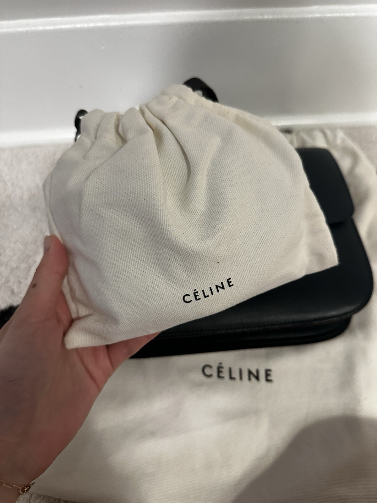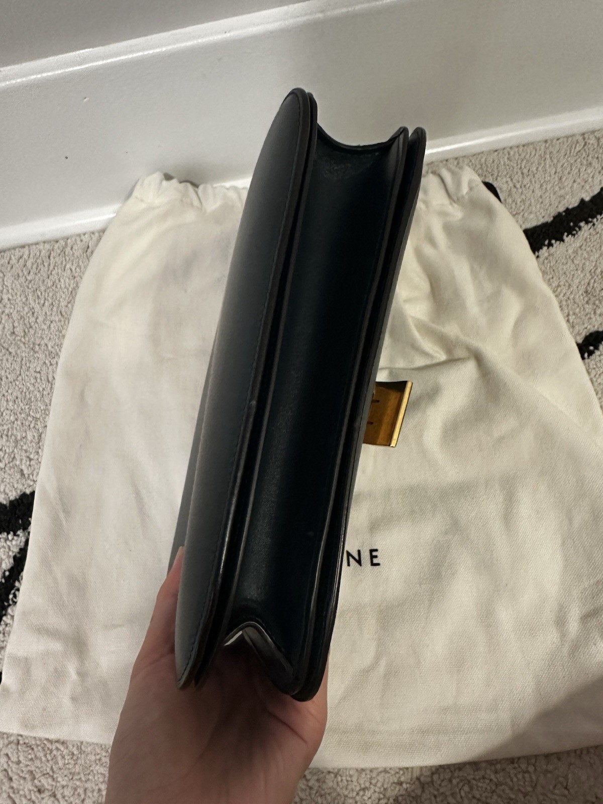 This Celine Classic Box Bag in deep green is in amazing condition—nearly like new. Barely used and impeccably maintained, the leather is smooth and structured with no visible signs of wear. The timeless gold-tone clasp adds an elegant touch, making it a sophisticated staple in any wardrobe. A true classic piece that combines understated luxury with enduring style!