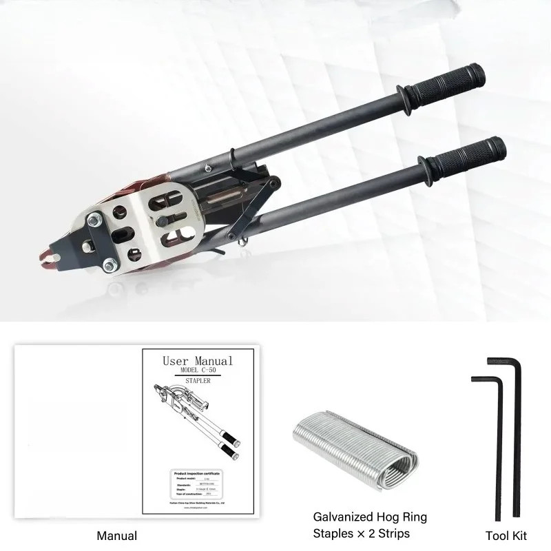 C-50 Manual C-Type Gun for Binding Stone Cage Nets, Cage Net Gun, C-Type Operating Instructions I. Loading Nails 1. Remove the air connector and perform this operation without power to avoid injury. 2. Select the required nail specifications. 3. Pull the nail pusher to load the nails into the nail slot. 4. Push the nail pusher in (close the magazine). 2. Nailing 1. Connect the air source. 2. Aim the gun nozzle at and press it firmly against the workpiece, then pull the trigger to fire. 3. Do not fire without nails (when the magazine is empty) to avoid damaging the firing pin components. 4. Do not fire into the air to avoid injury. III. Maintenance ◆ Before use, add 1–4 drops of pneumatic nail gun-specific lubricating oil to the nail gun connector inlet to improve work efficiency and extend the nail gun's lifespan. ◆ After use, add a few drops of pneumatic nail gun-specific lubricating oil and store in a dry place. Do not use oxygen or flammable gas as the air pressure source.