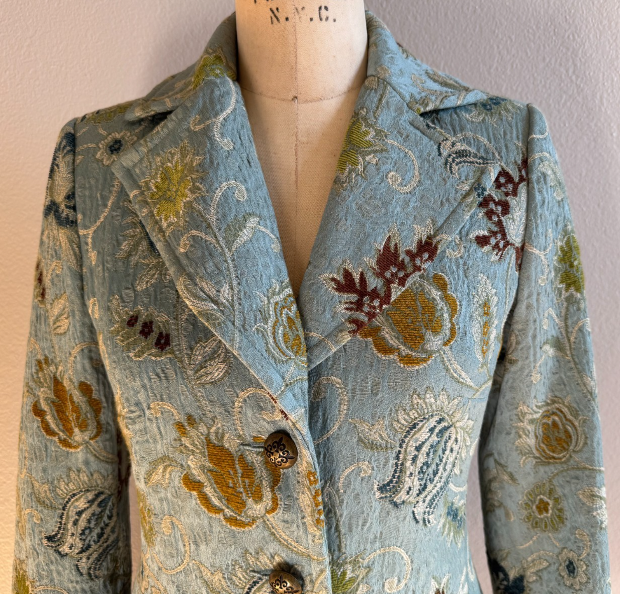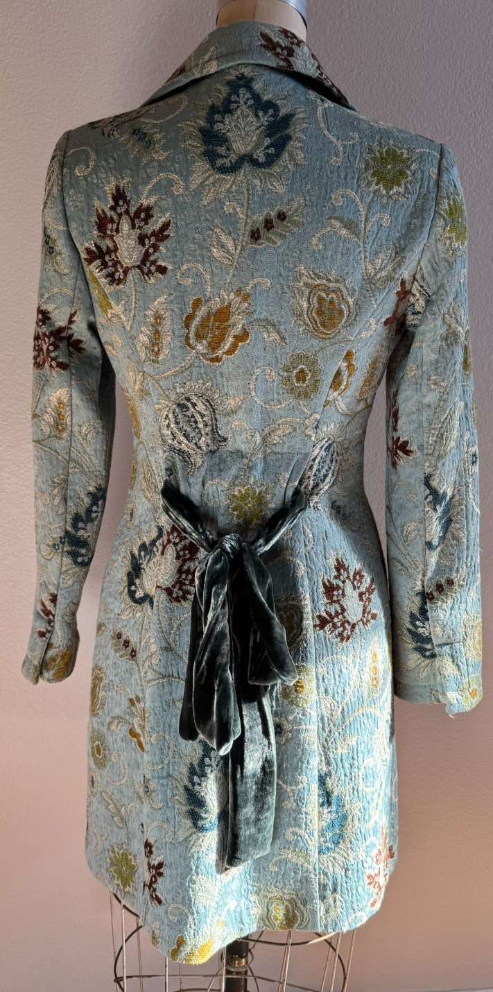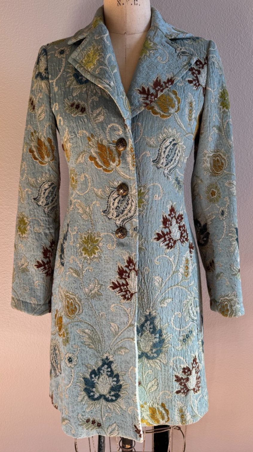 For Sale is a CABI Guinevere tapestry brocade jacket. This jacket features a collared neckline, antique style 3 button front with velvet removable tie/belt and long sleeves with slit cuff- no pockets. Colors include blue, brown and ivory. Classic vintage Cabi piece in great condition. Measurements: Chest- 36 1/2" measured armpit to armpit and doubled Length-35" Arm Length- 23"