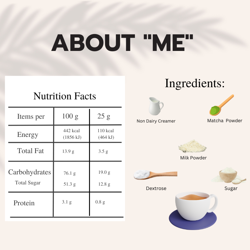 Our Matcha tea powder is crafted from the finest, fresh green tea leaves and undergoes a unique high-temperature steam process, preserving the natural color of the green tea leaf powder and its nutritional components. Caroma Premium Matcha Latte is carefully prepared to offer you the best. Each box contains 8โs X 25 Grams ๐ No Added Coloring ๐ No Preservatives ๐ Special High-Temperature Steam Process ๐ Japanese Matcha ๐ Matcha Drink Mix ๐ Green Tea Latte Ingredients: Non-Dairy Creamer (composed of Glucose Syrup Solids, Hydrogenated Vegetable Oil, Stabilizer E340(ii), Dipotassium Phosphate E341(i), Sodium Tripolyphosphate, Milk Protein, Sodium Caseinate Emulsifier E471, Mono and Diglycerides of Fatty Acids E481, Sodium Stearoyl Lactylate, Anti-Caking Agent E551, Silicon Dioxide), Dextrose, Milk Powder, Sugar, and Matcha Powder. CAROMA Premium Matcha Latte provides a quick and easy recipe that beautifully balances the vibrant, leafy taste of Matcha green tea powder with creamy milk and a touch of sugar, ensuring a delightful flavor profile that leaves you feeling refreshed and energized. You can enjoy it both hot and cold: Preparation Hot: Mix 1 sachet of Matcha Latte powder with 150ml of above 80ยฐC water, stir well, and savor the moment. Preparation Cold: Mix 1 sachet of Matcha Latte powder with 100ml of above 80ยฐC water, stir well, add some ice, and indulge in a refreshing treat." #Japanese Matcha #MatchaDrinkMix #GreenTeaLatte #HealthyLatte #MatchaBenefits #CafeStyleLatte #MatchaTea #DeliciousMatcha