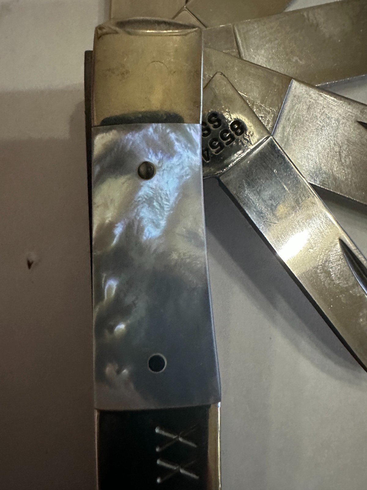CASE XX MOTHER OF PEARL BEAST KNIFE. THE BEAST IS A 5 BLADE TRAPPER. THE BLADES INCLUDE CLIP, RAZOR, SPEY, WARMCLIFFE, AND PEN. THE GENUINE MOTHER OF PEARL,HAS A NICKEL SILVER CIGAR BAND AND NICKEL SILVER BOLSTERS. THE LENGTH IS 4 1/8 INCHES CLOSED. THIS CASE BEAST IS 1 OF 1000 MADE AND HAS BEEN DISCONTINUED.