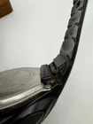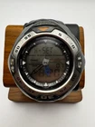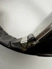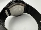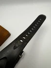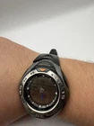This watch has a fresh battery and functions. Bezel turns counter clockwise. It’s stiff, but it does turn. It will need a new strap. Photos show where and how the band is cracked. Band keeper is also cracked. Please use photos to evaluate condition. Feel free to reach out with questions. Thank you!
