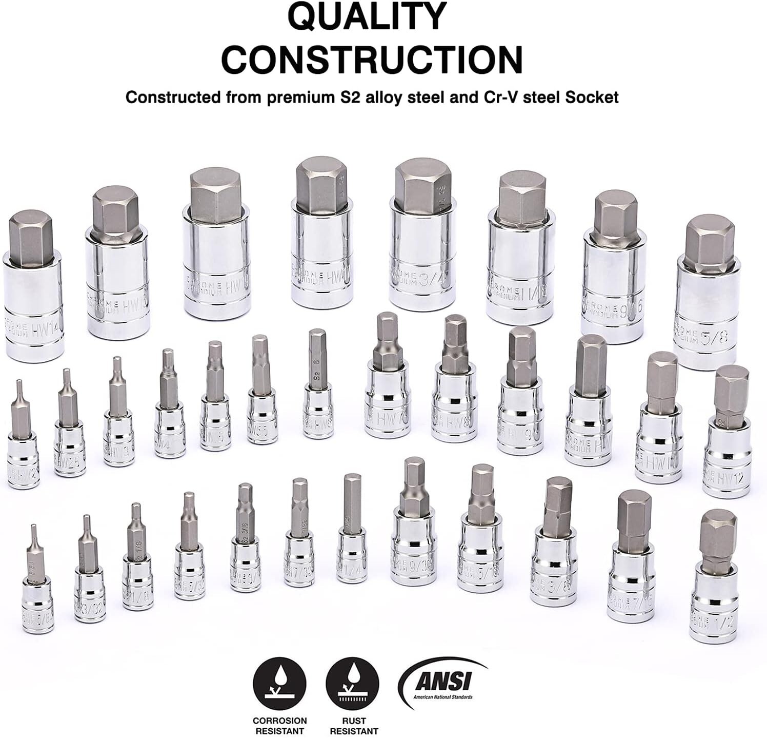 Constructed from S2 Steel and chrome vanadium steel (CR-V) for superior strength and longevity, Sockets features a chrome finish and bits are made from S2 steel bits to resist rust and corrosion 17-Piece Metric hex bit sockets include: 1/4” Drive: 2mm, 2.5mm, 3mm, 4mm, 5mm, 5.5mm, 6mm; 3/8” Drive: 7mm, 8mm, 9mm, 10mm, 11mm, 12mm; 1/2” Drive: 14mm, 15mm, 17mm, 19mm 16-Piece SAE hex bit sockets include: 1/4” Drive: 5/64”, 3/32”, 1/8”, 5/32”, 3/16”, 7/32”, 1/4”; 3/8” Drive: 9/32”, 5/16”, 3/8”, 7/16”, 1/2”; 1/2” Drive: 9/16”, 5/8”, 11/16”, 3/4” It comes with a durable blow-molded carrying case for easy transportation, safe storage, and quick organization Meets or exceeds ANSI performance standards. It comes with 1 year quality warranty.