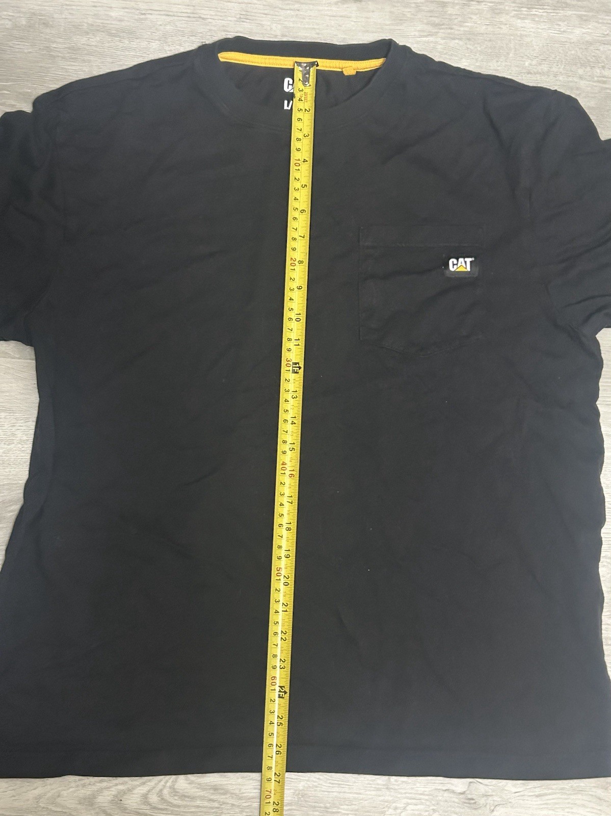 The CAT Caterpillar Men's Pocket Tee is a classic black t-shirt made from cotton with a crew neckline and short sleeves. This regular fit shirt features a logo accent on the front, pockets, and is machine washable. Perfect for the summer season, this 2020-2029 manufactured tee is a stylish and practical addition to any man's wardrobe.