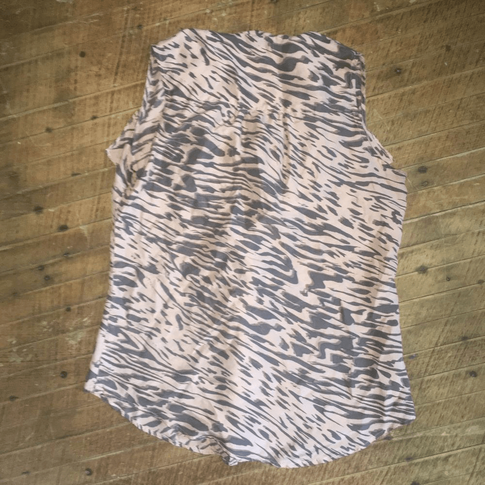Cabi brown and pink zebra striped shell with tuxedo ruffle down the front. In good, used condition. Approximately 20 inches from armpit to armpit, 24 inches long. From a pet and smoke free house. Happy to bundle!