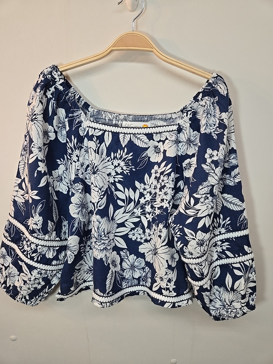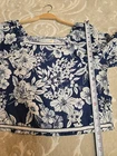 The C&C California Linen Navy/White Floral Square neck Puff Sleeve Boxy Top in size L is a stylish and comfortable option for women. Made of lightweight and breathable linen, this tunic-style blouse features a square neckline and 3/4 puff sleeves, perfect for travel or casual occasions. The floral pattern in navy and white adds a touch of elegance, while the relaxed fit ensures a comfortable and stylish look. Machine washable and suitable for all seasons, this top is a versatile addition to any wardrobe. In excellent like new condition No visible flaws 100% Linen Machine Wash Cold Super cute and elegant Please see photos for measurements and details :)