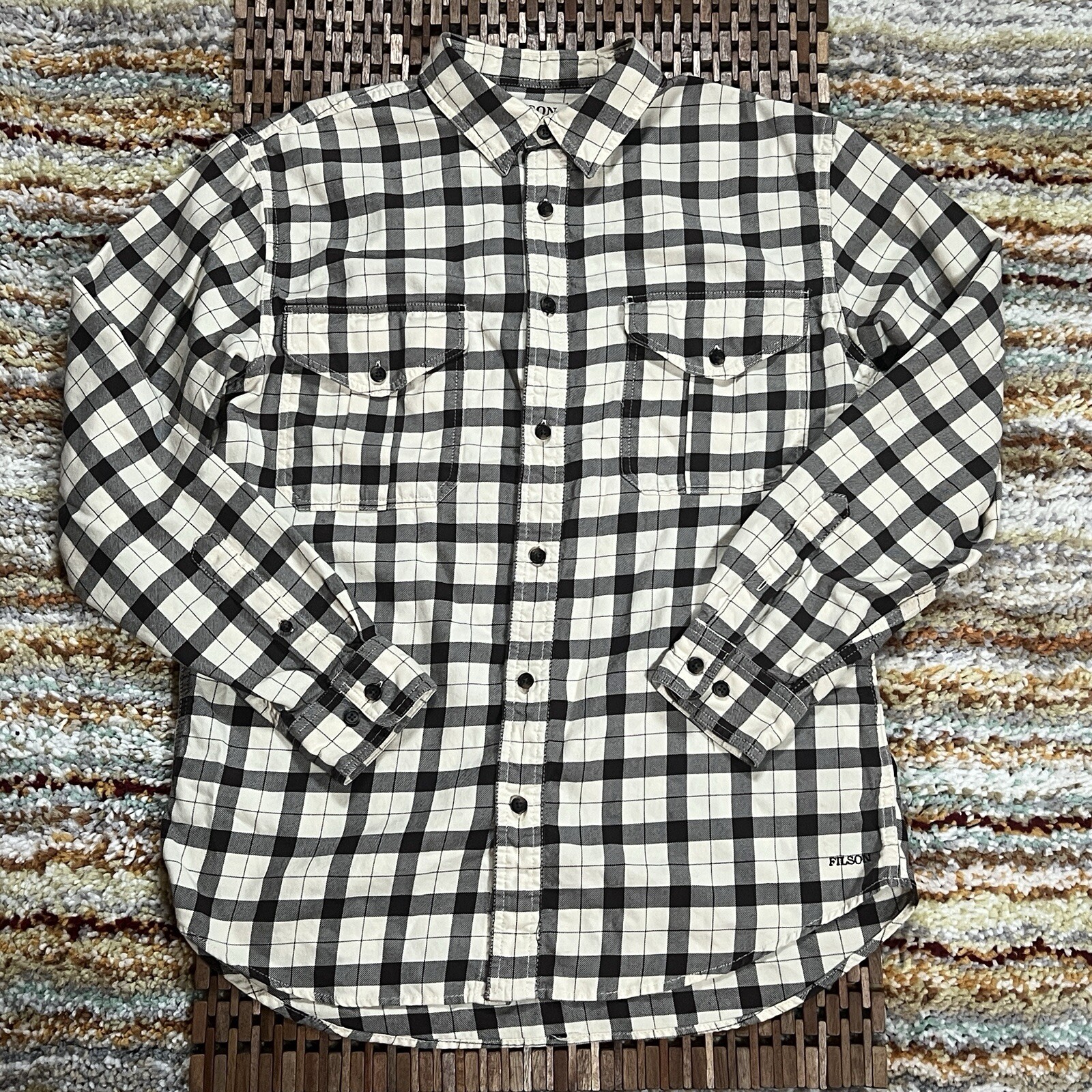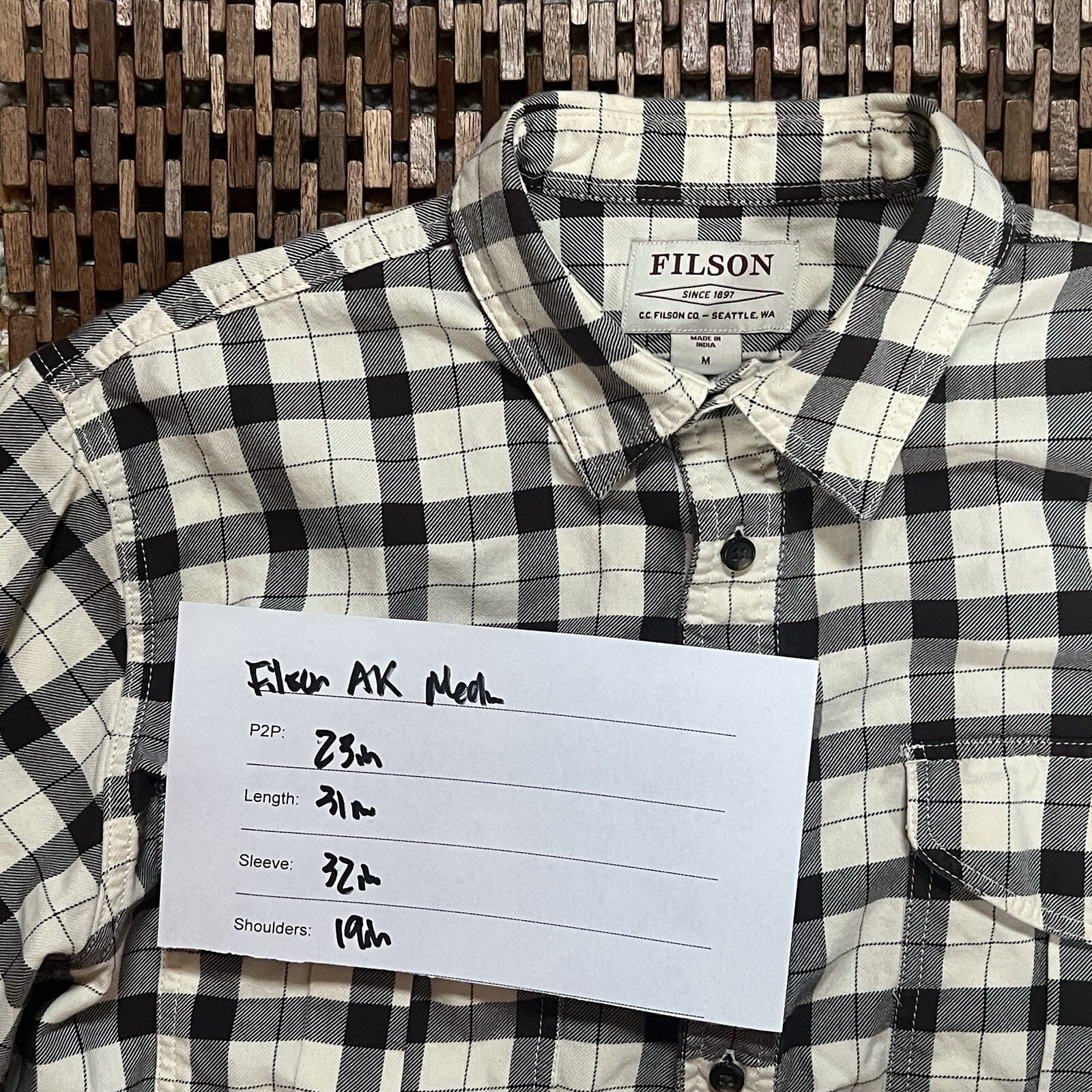 This is a Filson Alaskan Guide Shirt in size Medium. It is a solid beige shirt with a collared neckline, long sleeves, and a button-down closure. The shirt is made of cotton knit fabric and features a fisherman character with button accents. It has a regular fit and a button-down collar style, with a wrinkle-resistant feature. The design is American-themed and suitable for casual wear.