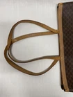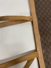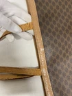 The CELINE Vintage Macadam PVC Shoulder Tote Bag M14 in brown monogram features a triangle shape with a button closure and gold hardware accents. This extra-large shoulder bag is made of lightweight coated canvas and PVC with leather straps and a logo accent. Perfect for various occasions including travel, weddings, parties, casual outings, formal events, workwear, and business meetings, this limited edition vintage bag exudes a classic yet bohemian vibe. Made in Italy, this stylish and practical tote bag is a must-have for fashion-forward person looking for a unique and timeless accessory. she has some wear and tear but still has a good amount of life in her, especially if she is fixed up a little.