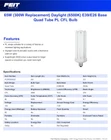 Store New Arrivals Add to Favorite View Feedback Contact CFL Quad Tube Light Bulb, 300W Equivalent, E26 Base with Mogul Base Adapter, 65-Watt CFL Light Bulb for Residential & Commercial Use, 6500K Daylight, 10,000-Hour Lifespan, PLF65/65/G2 Description Light Source Type Cfl Item model number PLF65/65 Number of Items 1 Country of Origin USA Power Consumption 65 Watts Department Unisex-Adult Controller Type Push Button Unit Count 1.0 Count Light Type CFL Bulb Shape Size E25 Product Dimensions 3.12 x 3.12 x 11.12 inches Material Plastic Model Name Quad Tube Fluorescent Light Bulb Specific Uses For Product Lamp Included Components 1 pk FLUORESCENT QUAD-TUBE LIGHT BULB Item Package Quantity 1 White Brightness 4550 Lumens Indoor/Outdoor Usage Outdoor Light Source Wattage 65 Watts Brightness 4550 Lumen Control Method App Light Color 6500K Daylight Item Weight 6.4 ounces Connectivity Technology Normal bulb Special Feature Non Dimmable, Energy Efficient Color Rendering Index 65 Bulb Base E26 Color Temperature 6500 Kelvin Wattage 65 watts Incandescent Equivalent Wattage 300 Watts Shape Tubular(T) Voltage 1 ENERGY-EFFICIENT LIGHTING SOLUTION - This 65-Watt CFL bulb delivers a powerful 300-Watt equivalent output, providing bright, clear illumination with minimal energy consumption. Perfect for residential and commercial use, this energy-efficient bulb helps reduce electricity bills while maintaining superior lighting quality. BRIGHT 6500K DAYLIGHT COLOR - This CFL bulb emits a bright 6500K daylight color temperature, ideal for creating a crisp and refreshing atmosphere in kitchens, garages, workshops, offices, and more. It provides excellent visibility and clarity, mimicking natural daylight to boost productivity and enhance comfort. MOGUL BASE ADAPTER INCLUDED - Designed with an E26 base and includes a mogul base adapter for easy installation in a variety of fixtures. This versatile CFL light bulb offers the flexibility to be used in different light sockets, ensuring compatibility with a wide range of lighting setups. LONG LIFESPAN & DURABILITY - Enjoy up to 10,000 hours (or 9.1 years) of reliable lighting with this durable CFL bulb. With an extended lifespan, it reduces the need for frequent replacements, making it a cost-effective solution for both home and business environments. IDEAL FOR VARIOUS APPLICATIONS - Whether you're looking to illuminate large spaces like warehouses or enhance your home’s lighting, this CFL bulb is versatile enough for use in a wide range of applications, including residential, commercial, and industrial settings. The PLF65/65 65W Feit Electric CFL natural daylight bulb produces 4550 lumens of 6500K Daylight while using only 65 watts of electricity - up to 76% less energy than an equivalent 300-watt incandescent light bulb. This non-integrated CFL quad-tube lamp comes with a mogul base adapter and has an average life of 10,000 hours/9.1 years. Choose a dependable general-purpose compact fluorescent bulb for residential or commercial applications. ABOUT US We offer the best prices around on high quality products. Our E-store includes media such as books, movies, music and games while offering electronics, toys, sporting apparel, clothing, tools, general home, garden items and more. SHIPPING We are always working hard to ensure your package arrives as soon as possible. Please understand that some factors like weather, high postal traffic, and the performance of shipping companies are outside of our control. We offer free shipping to the lower 48 states and ship within 2 business days of payment, usually sooner. We do not accept P.O. Boxes. Please provide a physical address. For shipping outside of the continental USA, we only use eBay's Global Shipping Program.The item is shipped to KY and then sent to the rest of the world. International customers are responsible for all duties and taxes. Continue to check out in order to calculate costs for shipping the item to your country. Messages regarding eBay's Global Shipping Program MUST be directed at eBay EXCLUSIVELY. RETURNS We offer a 30-Day Return Policy on items which you are not completely satisfied with. You have the option for a full-refund or an exchange of the item. No returns are available on items shipped outside of the USA. PAYMENT We accept PayPal. CONTACT US This page content is yet to come Please ad us to your favorite seller and visit again later Thank You CUSTOMER SATISFACTION We try our very best to make sure every customer is completely satisfied. If there's a problem, message us! We're happy to help. WE ACCEPT Copyright © 2021 AutoDS. | All Rights Reserved