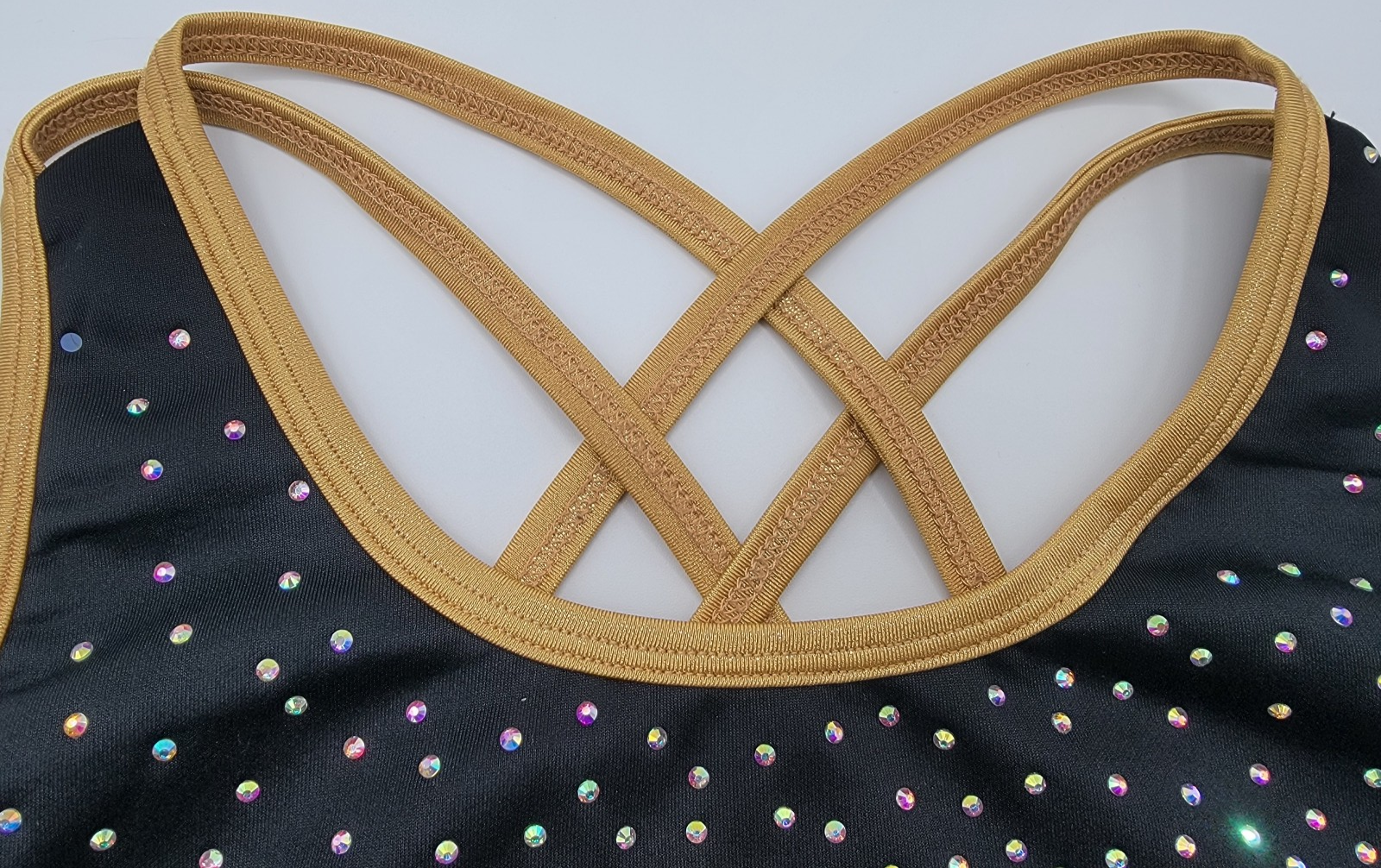 This RAD sports bra appears in excellent pre-owned condition. It appears to be missing 2 rhinestones. No other noted imperfections. CHAMPION CHEER women's cheerleading dance sports bra black gold rhinestone BLING!