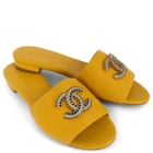 Welcome to LUX l Authentic Designer Consignment Rämistrasse 25, 8001 Zürich, Switzerland I Tue-Fri 11-18:30 & Sat 11-16:00 By bidding on our auctions you are agreeing to our Terms and Conditions below. All items come with authenticity guarantee! ------------------------------------------------------------------------------------------------------------------------------------------ Product Description: These 100% authentic Chanel slide sandals in yellow lambskin exude effortless elegance with a nod to ancient Egypt. They feature a wide band adorned with an enamelled CC emblem in vibrant shades of red, aqua, and navy blue. Designed with rounded toes and flat soles, they offer both style and comfort—perfect for elevating any warm-weather look. Brand new. Come with dust bags. 2019 Paris-New York Metiers d'Art Measurements Model 19A G35040 X53033 Imprinted Size 41 fit 40 Shoe Size 40 Inside Sole 26.5cm (10.3in) Width 8cm (3.1in) Heel 2cm (0.8in) Hardware Gold-Tone All our listings include only the listed item unless otherwise specified in the description above - Price does not include import duties & taxes - check your countries import laws prior purchase ------------------------------------------------------------------------------------------------------------------------------------------ Terms & Conditions Luxury-Shops is not affiliated with any of the name-brand items we offer for sale. Warranties and Liabilites: Luxury-Shops declines all responsibility and cannot be held liable for any damages caused by the use of a specific garment. We also cannot be held responsible for the quality of an item (we are not the manufacturer) or any damages resulting from a manufacturing defect. No warranties of any kind are given or implied. Condition of Merchandise: Luxury-Shops offers for sale luxury top-quality products. We fully disclose the condition of each item. In the description of each product, Luxury-Shops will specify the conditions if different from the standards set by the market (Required disclosure of prior use) The main characteristics of products are shown in great detail (through numerous photographs and in-depth descriptions). The products offered for sale MAY NOT correspond to the real garments in terms of image and color because of the Internet Browser or Monitor used (color calibration). Luxury-Shops disclaims all responsibility. Every used item offered by Luxury-Shops has been cleaned and restored to the best possible condition unless noted otherwise. Every used or vintage handbag has been polished and refinished. Your purchases will be sent to you ready to be used or worn. Please be aware that vintage items may be delicate and may not be as resilient as a brand-new item. Please take appropriate care when using a vintage item. Damage to items after receipt or use by customers is not the responsibility of Luxury-Shops. Luxury-Shops is a reseller of authentic designer and vintage merchandise. We are not an authorised dealer and are not affiliated with the brands we sell on our site. Store-new designer items are only available from an authorised dealer or the actual store. Once the item leaves the authorised dealer with a customer, the item is considered pre-owned. However, items can be pre-owned and in new condition - that is, never used by the owner. Below are the definitions of the descriptions we use. NEW : in new condition, that is, never used . This means the item may have been purchased by us from an authorized dealer or a store. New items may also be pre-owned, that is, purchased by one of our consignors and never used. These items may have minor signs of handling as would any item available at an authorized dealer or boutique given that customers would reasonably handle an item when trying it on or examining it for purchase. USED: the item has been carried or worn and may be in any of the conditions described below. PRISTINE/VIRTUALLY NEW : Appears to have been used only a handful of time and is nearly new in condition. May have very slight signs of having been used upon close inspection. EXCELLENT : Used and in top condition. There may be faint signs of wear, slight scratches, marks or nicks which are not particularly noticeable and will not affect the use or wear of the item. Our descriptions and photographs will clearly indicate the condition of the item. GOOD : Used, may be an older or well-loved item. There may be slightly more noticeable signs of wear, scratches or marks. These will not affect the wear or use of the item. Our descriptions and photographs will clearly indicate the condition of the item. VINTAGE : Typically around 20 to just under 100 years old. Our vintage items are carefully examined and selected. Most are gently or rarely used, meticulously stored or cared for and will come to you in a perfectly usable condition. However, these are unique items which may be of a finer and more delicate nature than brand-new items so please be sensitive to this and have reasonable expectations of their resilience. We do not make allowances for unreasonable expectations in the condition of our items. Product Descriptions: We make every effort to display the products featured on our web site as accurately as possible, using a large array of unaltered digital photographs and detailed descriptions. Our examination and assessment of merchandise is meticulous and conducted with great attention to detail. Our expertise and product knowledge comes from many years of experience with authentic designer and vintage items. We make as much effort as is humanly possible to disclose all relevant information required for you to be completely confident about your purchase. However, the display and colour capabilities of your computer monitor could affect the colours you see on the screen and these may differ from the actual product. Luxury-Shops is not responsible for monitor limitations and cannot guarantee that a monitor's display of any colour, texture, or detail of merchandise