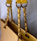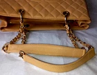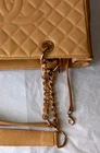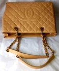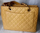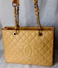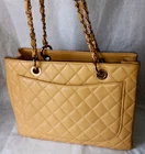 CHANEL ========================================================================== CAMEL BEIGE MATELASSE CAVIAR SKIN QUILTED LEATHER CHAINED HANDLES TOTE SHOULDER HANDBAG MADE IN ITALY MEASURES: 13" L x 9.5" H x 5" D MAIN COMPARTMENT WITH ZIP and SLIP POCKETS. ZIP COMPARTMENT ON A MIDDLE WITH LOGO PULL. TWO CHAINED HANDLES. LARGE SLIP POCKET ON A BACK. GOLD SATIN LINING. KEY HOLDER. GOLD TONE HARDWARE. IN VERY GOOD CONDITION, SEE PHOTOS (just minor wear on corners; clean inside with minor wear on lining) ====================================================================