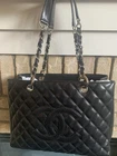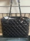 The CHANEL Caviar Grand Shopping Tote in Black Leather is a stylish and luxurious handbag designed for women. This tote is in near new condition and features a zip closure, silver hardware, and a quilted finish, adding a touch of elegance to any outfit. The black leather exterior and black lining complement each other seamlessly, while the metal handle/strap in black and silver looks chic and durable. With a spacious interior and a convenient strap drop, this CHANEL Caviar Grand Shopping Tote is both practical and fashionable, making it a must-have accessory for any fashion-forward individual. Purchased from The RealReal and will provide receipt.