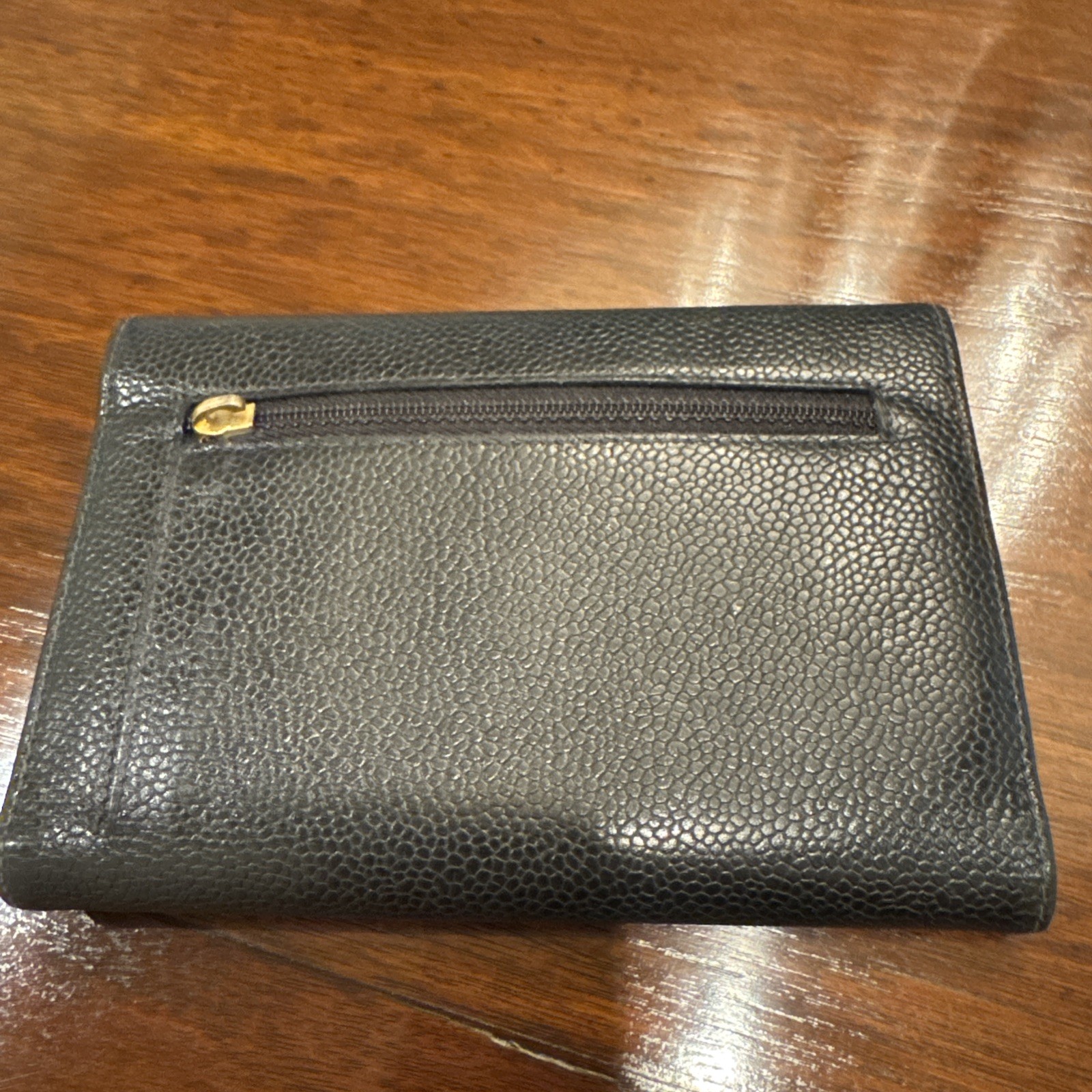 The CHANEL CC Logo Grained Calfskin Trifold Wallet in black is a luxurious and stylish accessory for women. Made of high-quality leather with a grained finish, this wallet features the iconic Chanel CC logo as an accent. The tri-fold design offers convenience and functionality, along with multiple credit card slots for organization. With its vintage charm, this wallet adds a touch of sophistication to any outfit, making it a must-have for Chanel enthusiasts and fashion-forward individuals alike. Used. Zipper pull is missing