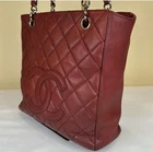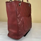 CHANEL CC Quilted Caviar leather Petite Shopping Tote PST with Silver Hardware. Leather Comfort Straps at shoulder. Serial Sticker 12 series dated 2008-2009. Details: Made in Italy Red Bordeaux color Exterior back pocket Magnetic closure Fabric interior with one slip and one zipper pocket Cleaned and conditioned. Please refer to the pictures to view the item for detailed inspections. The bag is preowned and may show signs of wear and scratches. Imperfections are unique aspects of vintage items. Inspect all pictures closely prior to making an offer.